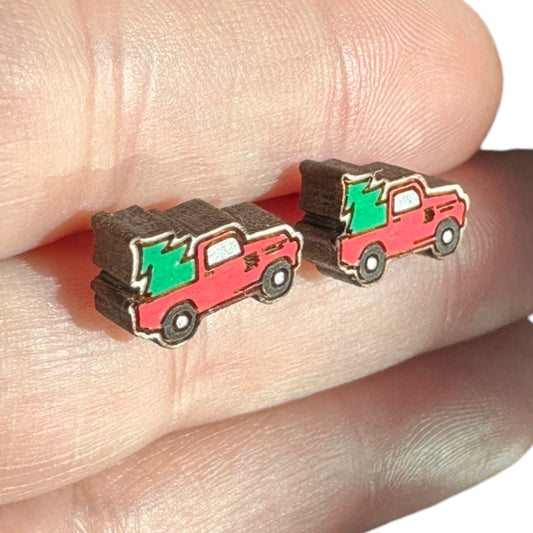 Hypoallergenic Christmas Vintage Truck and Tree Laser Engraved Wooden Earrings