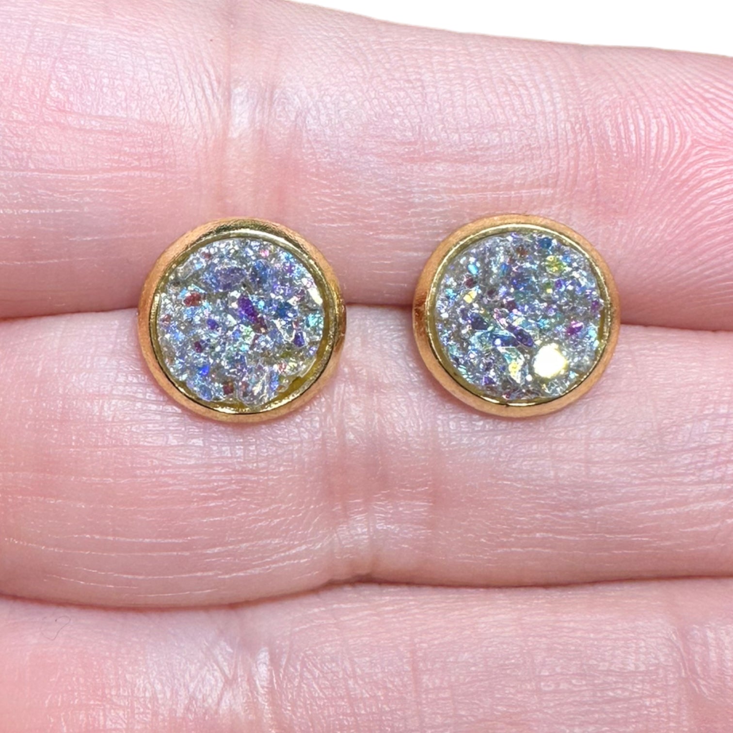 Faux druzy earrings made from epoxy resin to give some added sparkle too any outfit!  The iridescent flecks of color change depending on which angle you are looking!