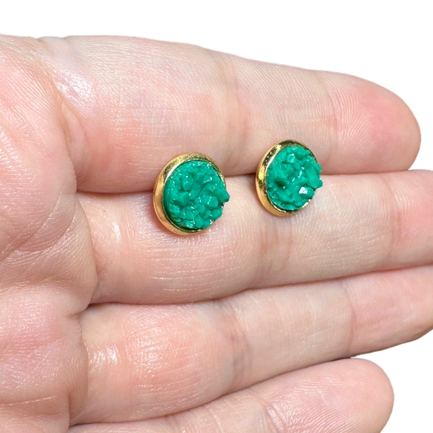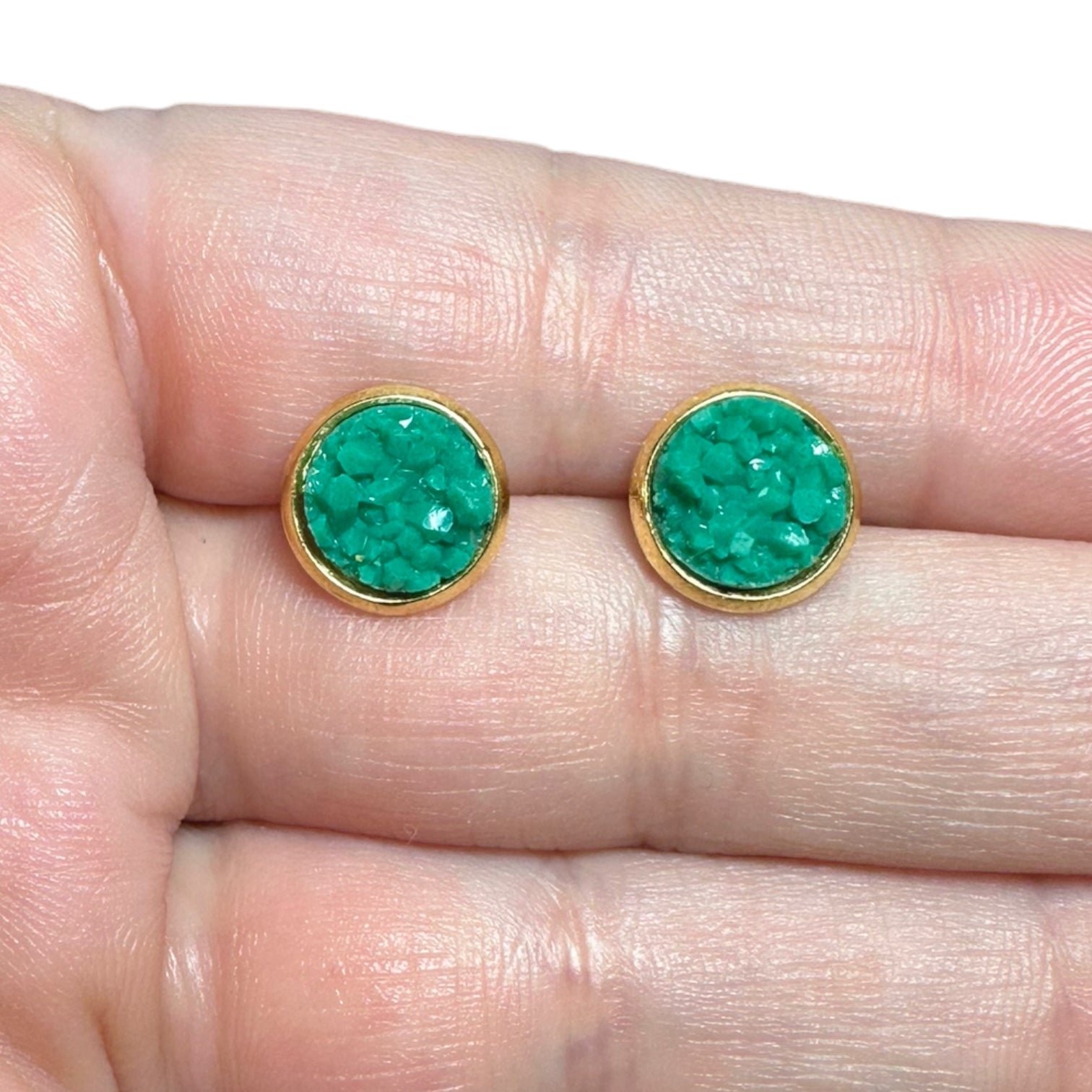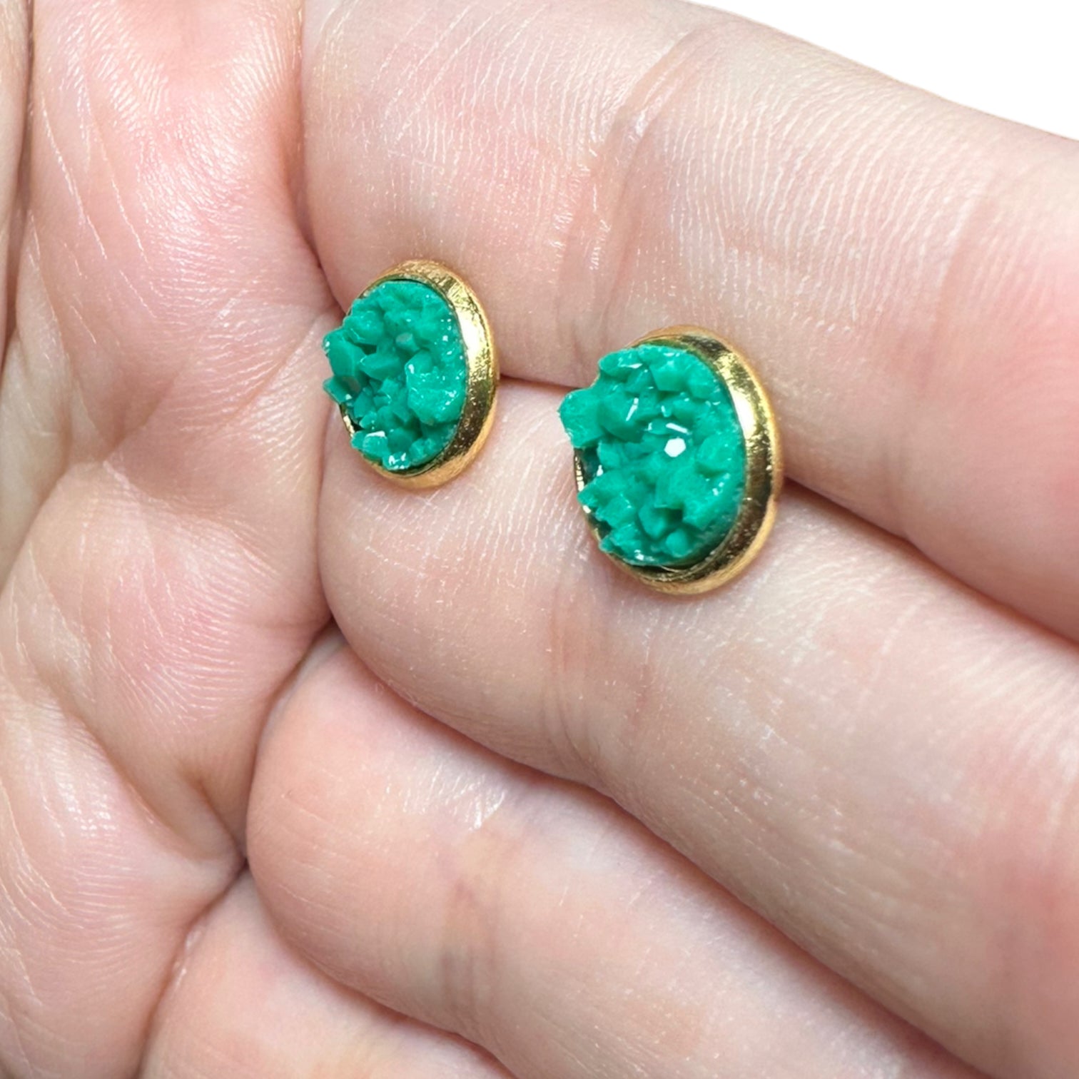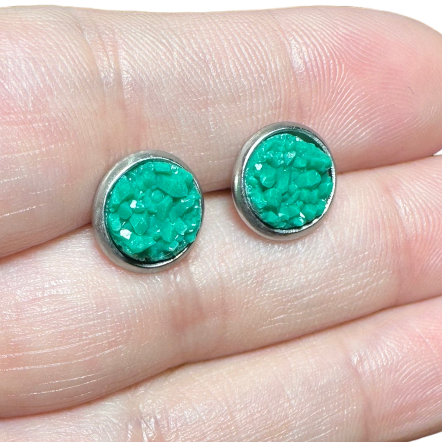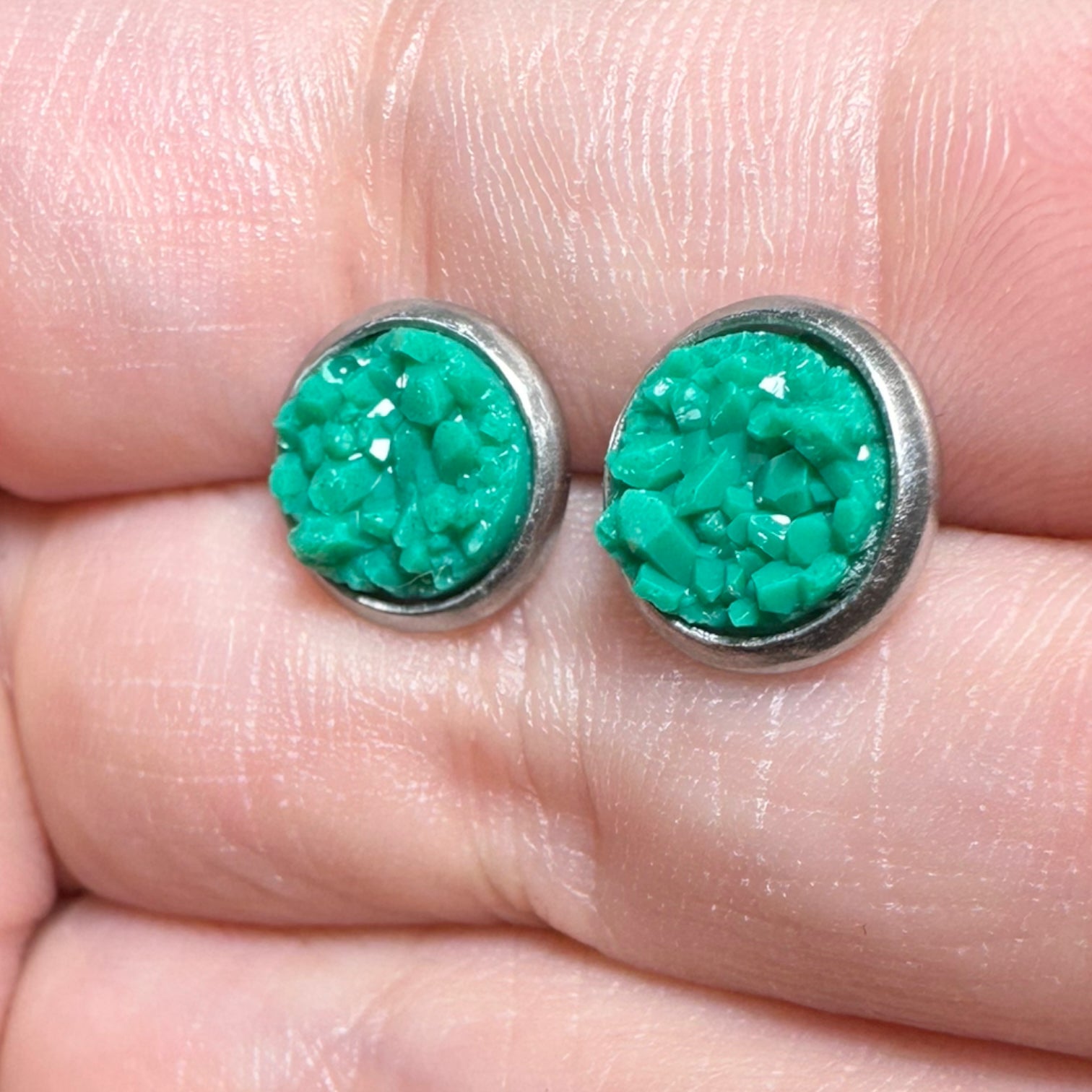 Faux druzy earrings made from epoxy resin to give some added sparkle too any outfit!  The iridescent flecks of color change depending on which angle you are looking!
