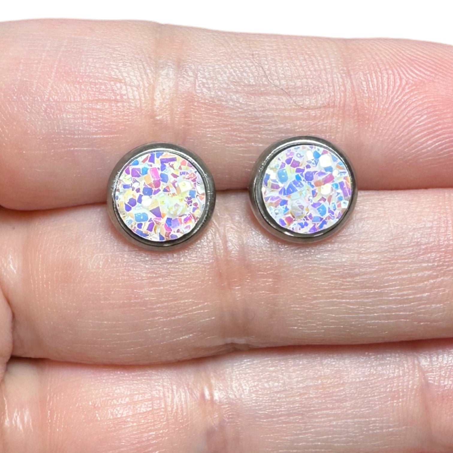 8MM Hypoallergenic White with Multi-Colored Sparkle Druzy Earring Studs