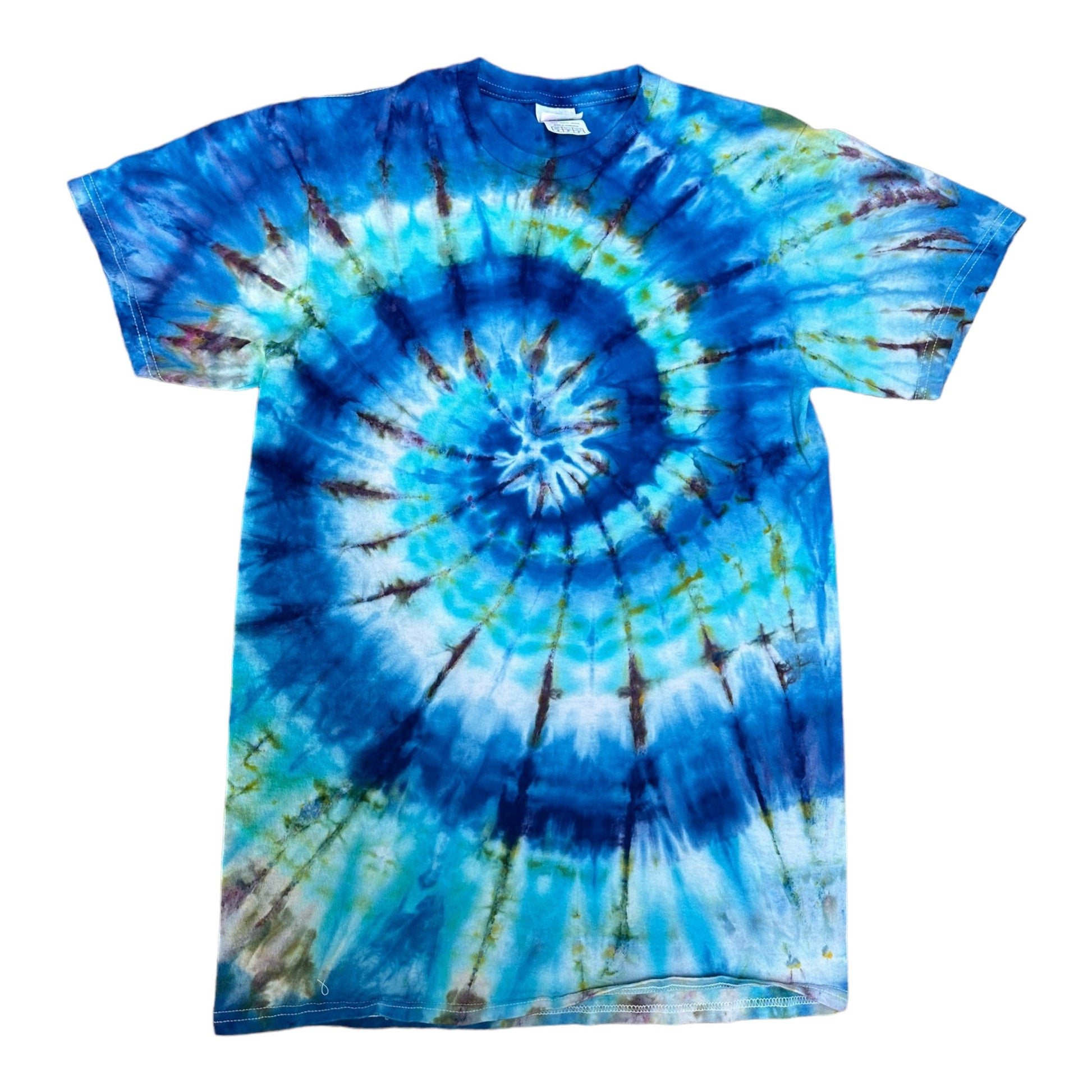 Adult Small Blue Green and Brown Spiral Ice Dye Tie Dye Shirt