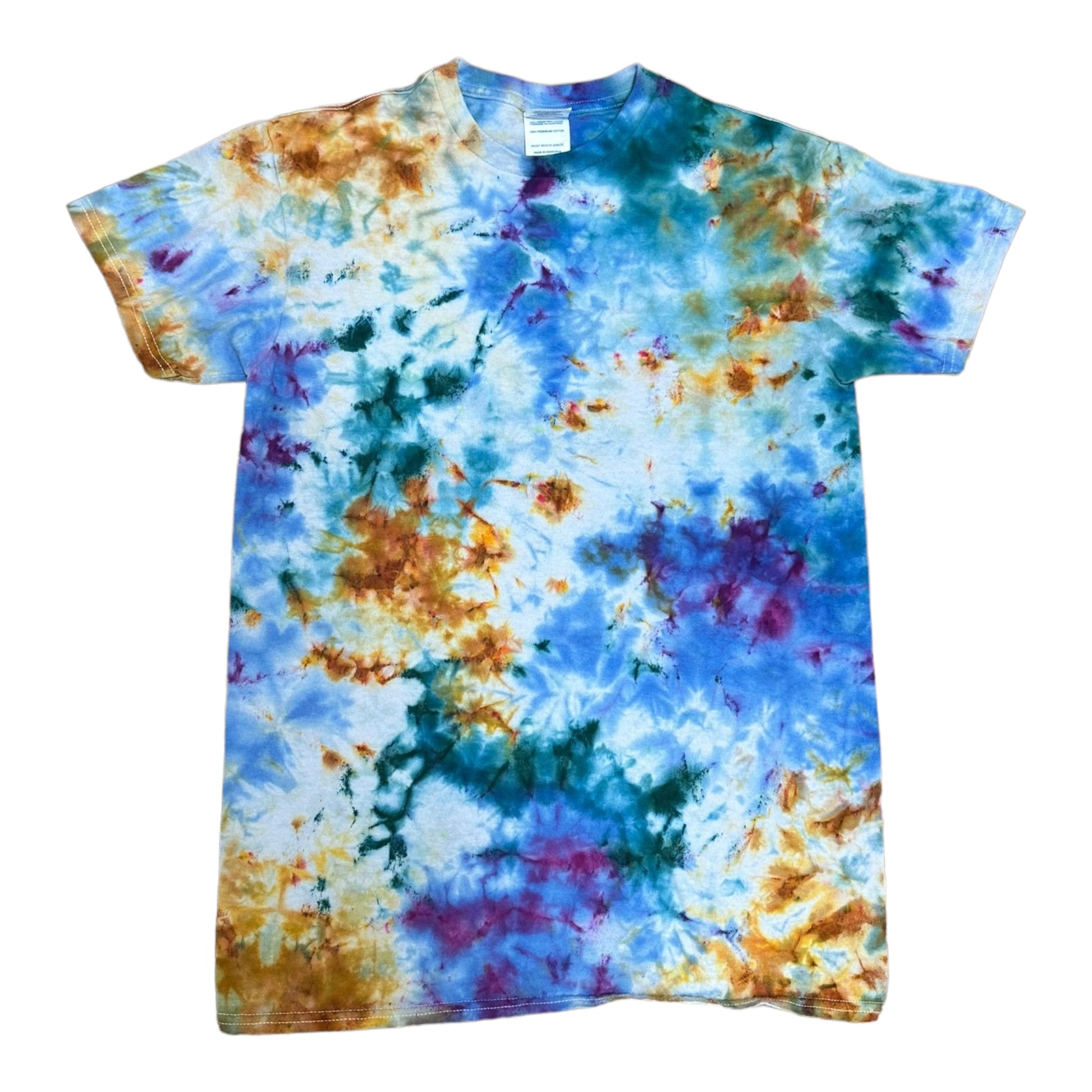 Adult Small Golden Yellow Blue Purple and Teal Scrunch Ice Dye Tie Dye Shirt