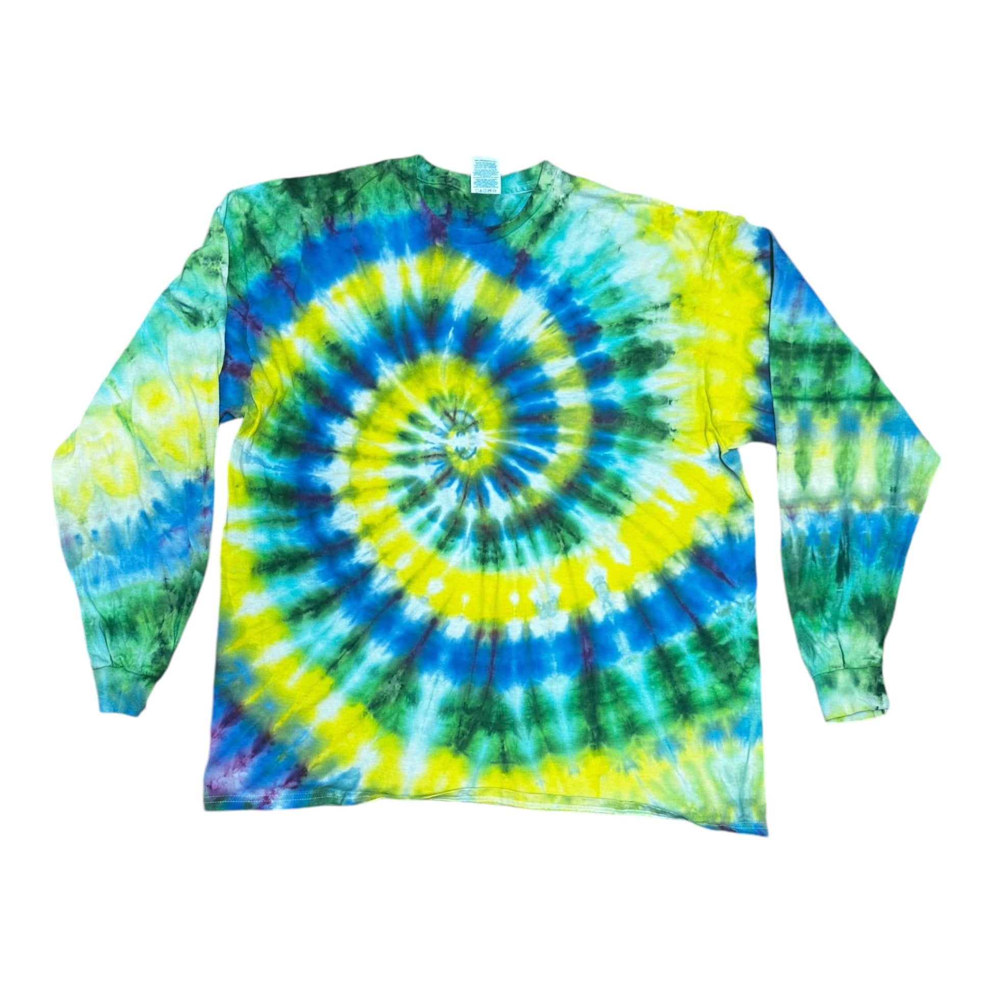 Adult XL Blue Yellow and Green Spiral Ice Dye Tie Dye Long Sleeve T-Shirt