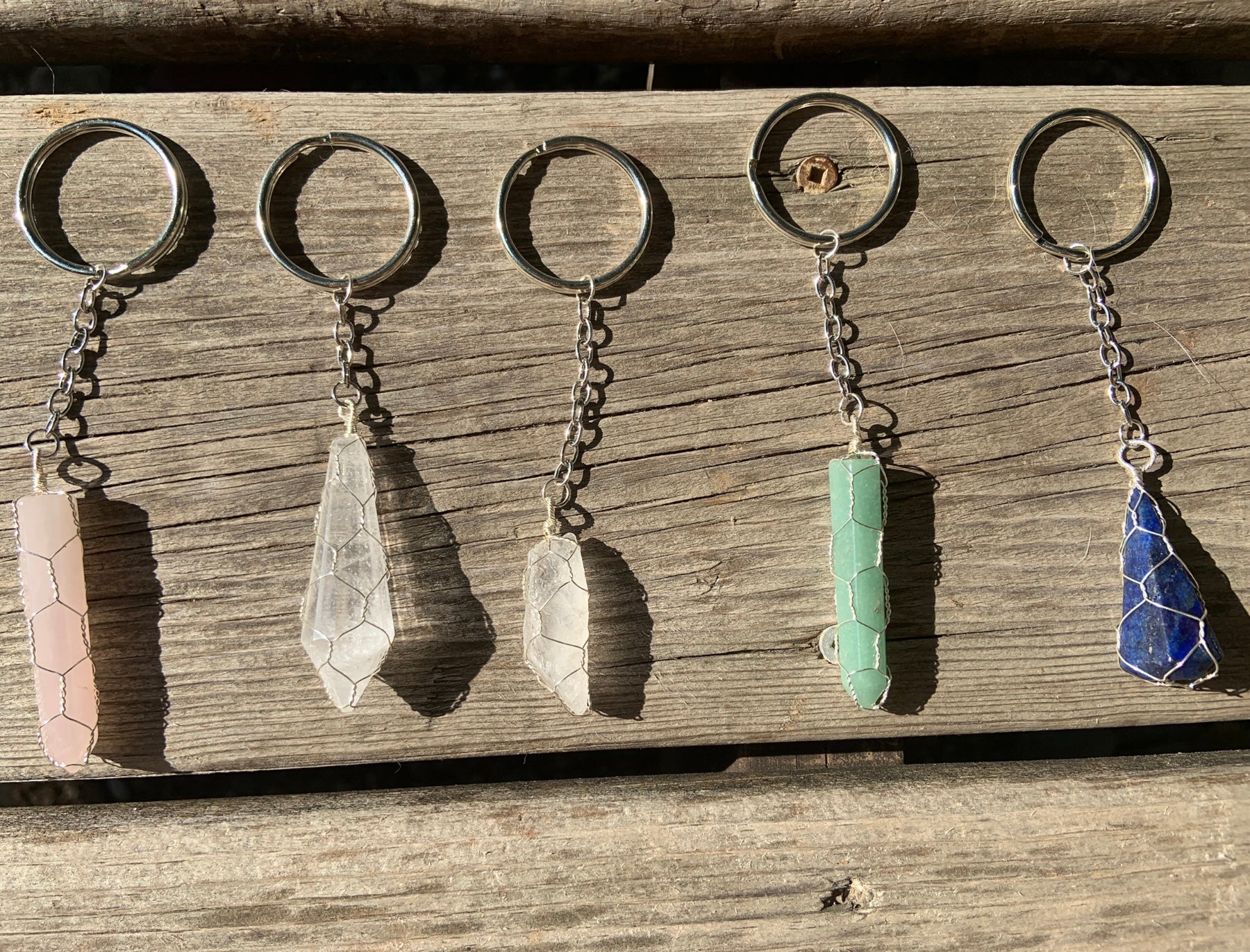Handmade in Lincoln, Nebraska. Crystals are wire wrapped and attached securely to sturdy silver chain in these crystal keychains. Each crystal is picked based on the protective properties and good vibes they provide the recipient.