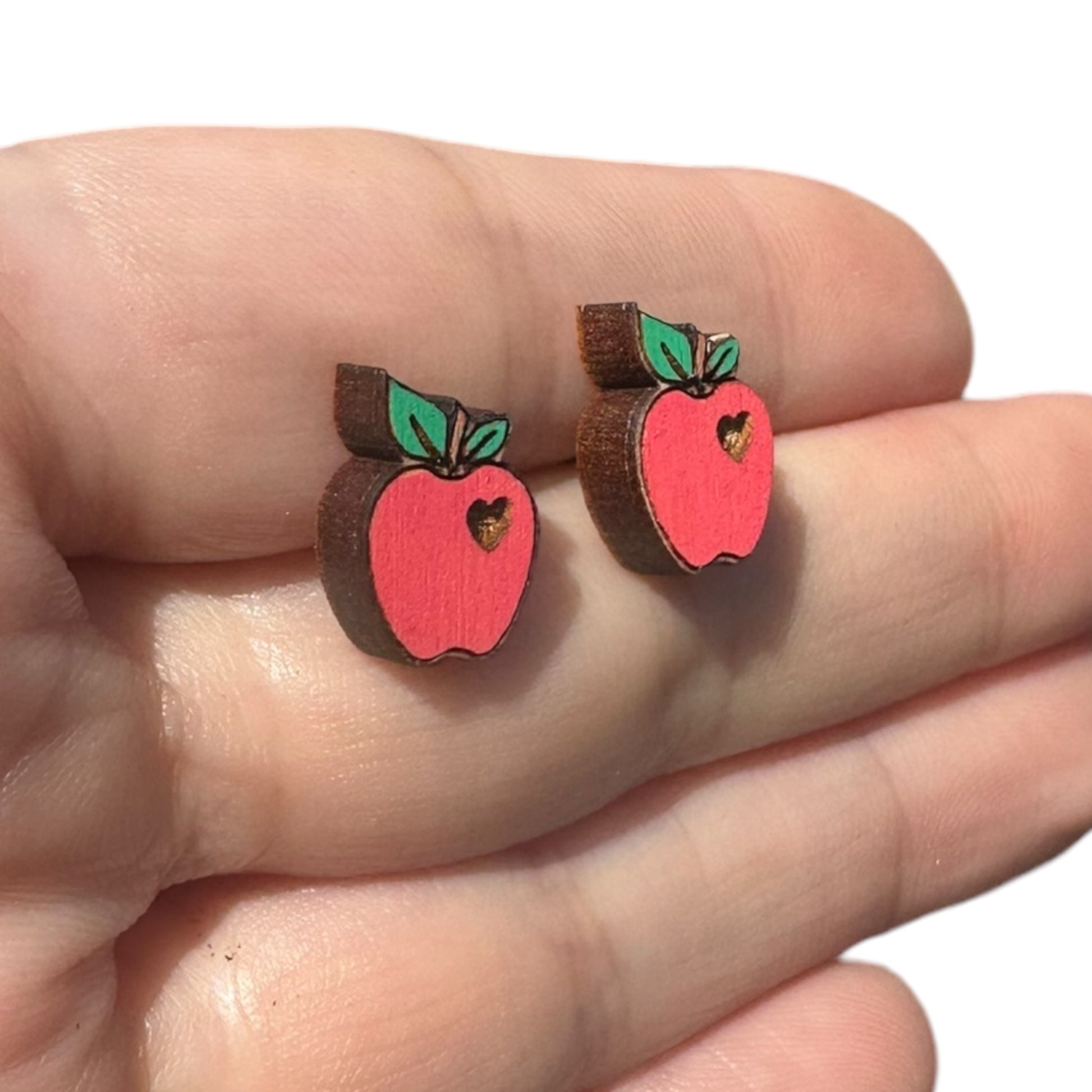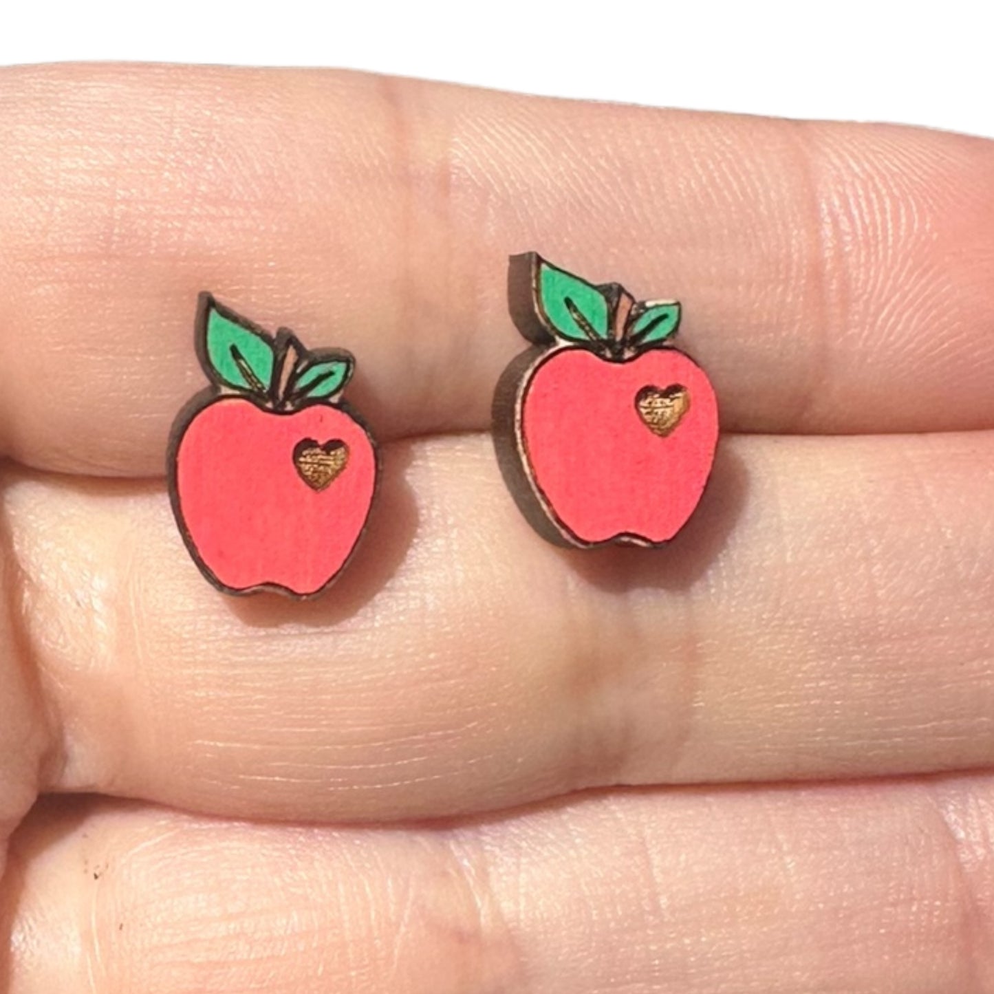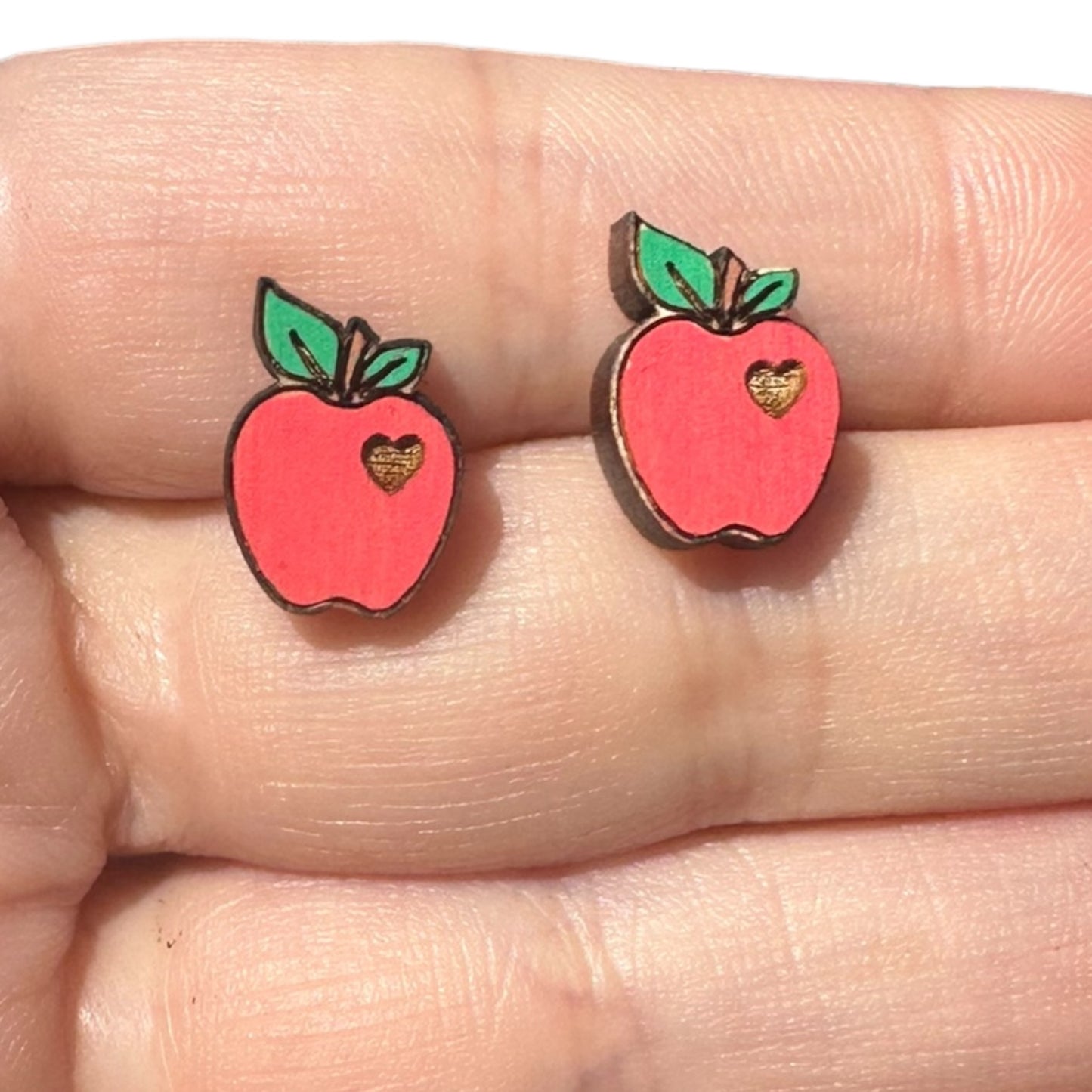 Hypoallergenic Hand Painted Apple with Heart Laser Engraved Wood Stud Earrings