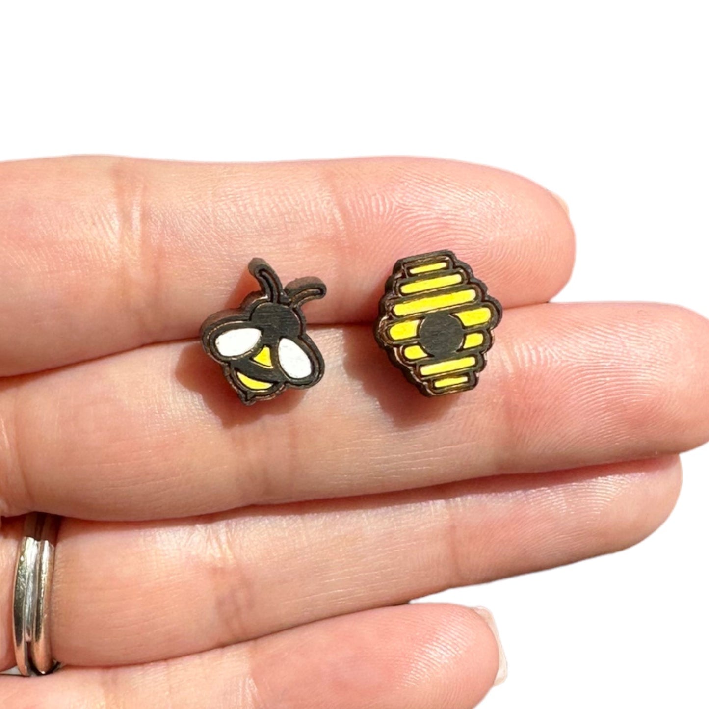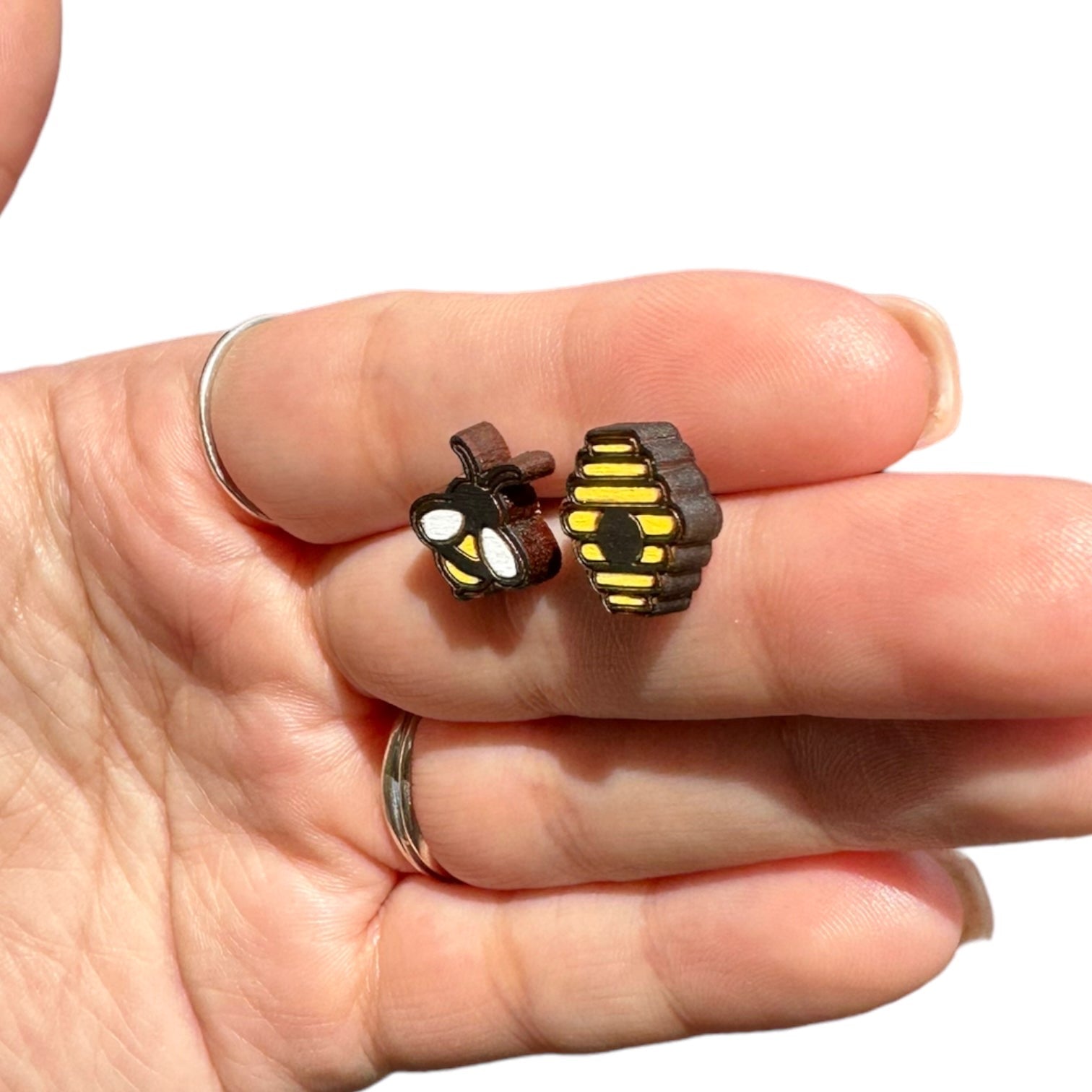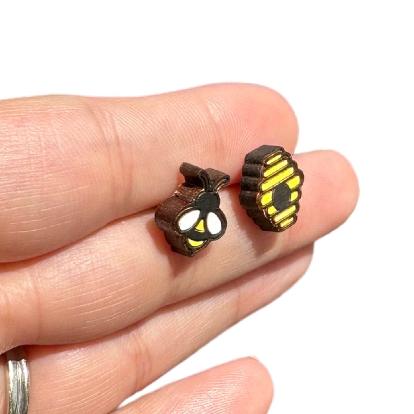 Hypoallergenic Hand Painted Bumble Bee and Beehive Laser Engraved Wood Earrings