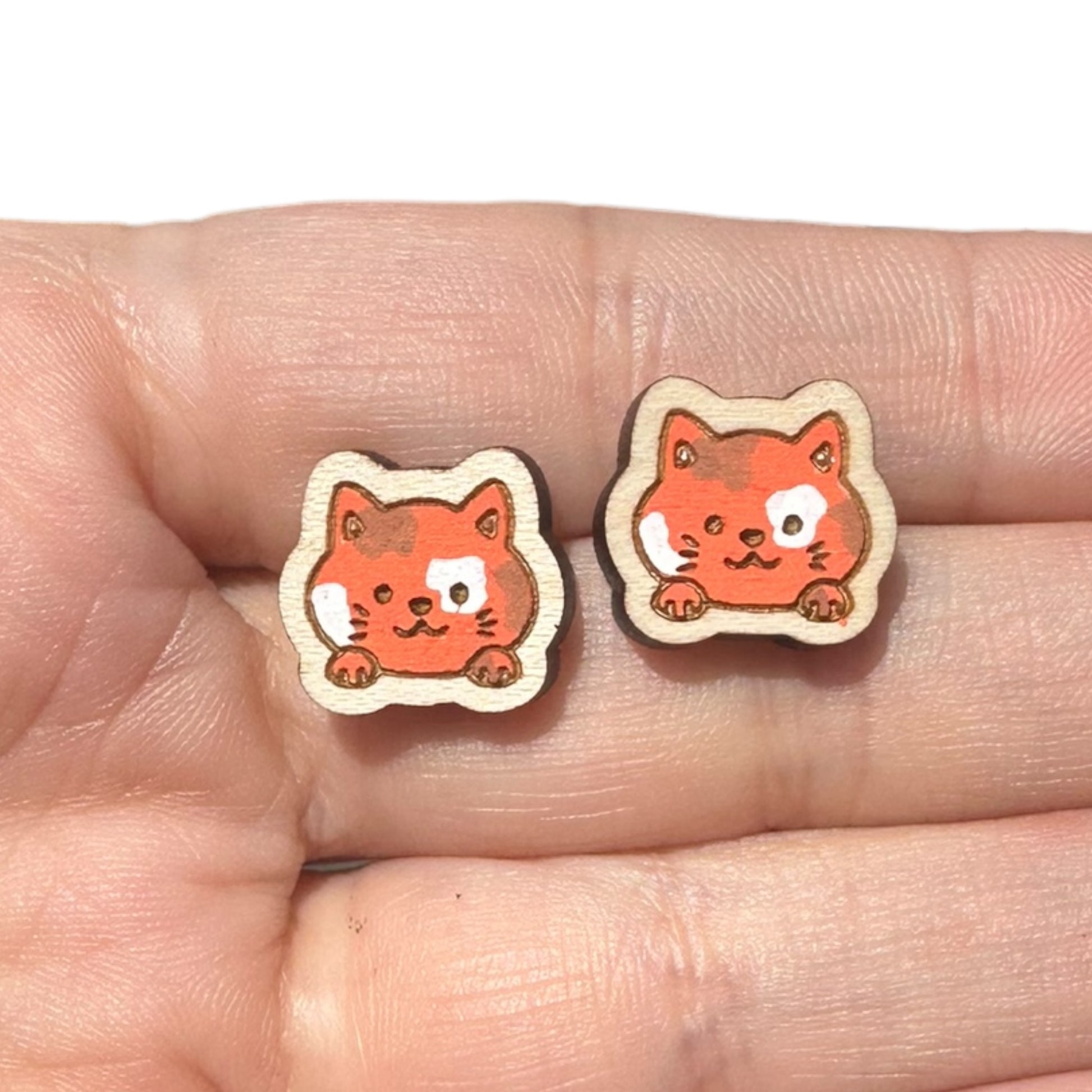 Hypoallergenic Hand Painted Cat Laser Engraved Wood Stud Earrings