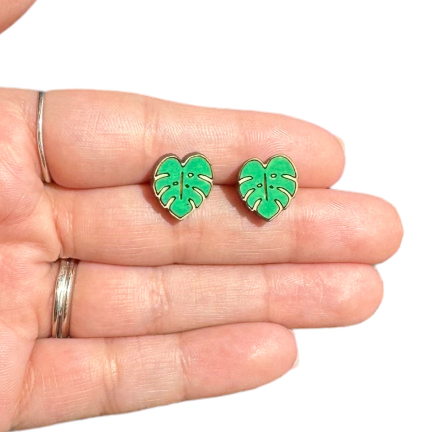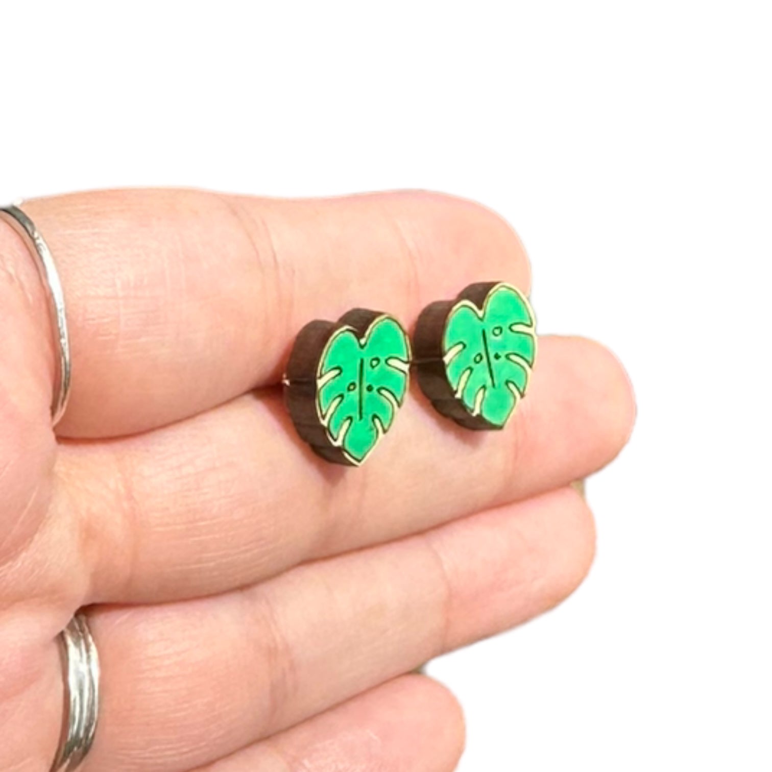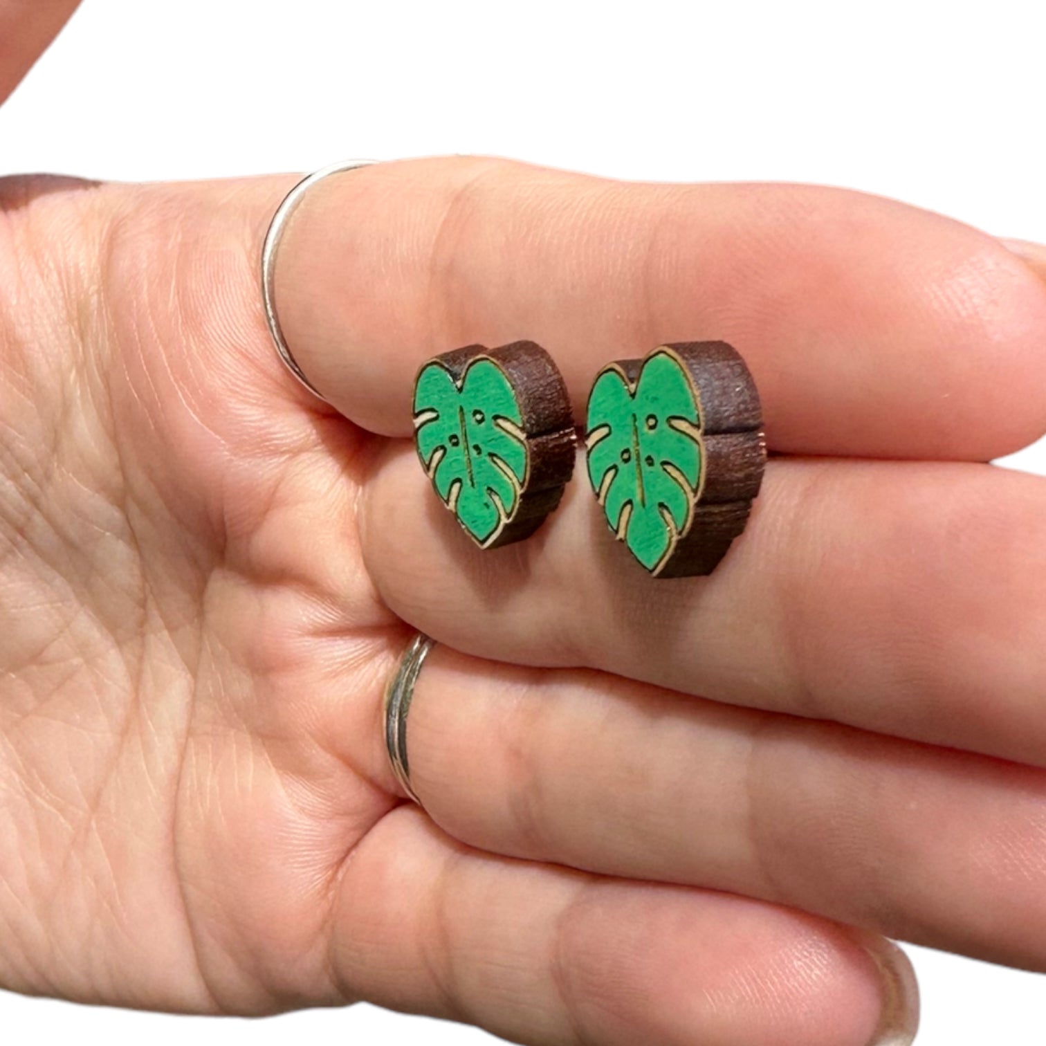 Hypoallergenic Hand Painted Green Botanical Leaf Laser Engraved Wood Stud Earrings