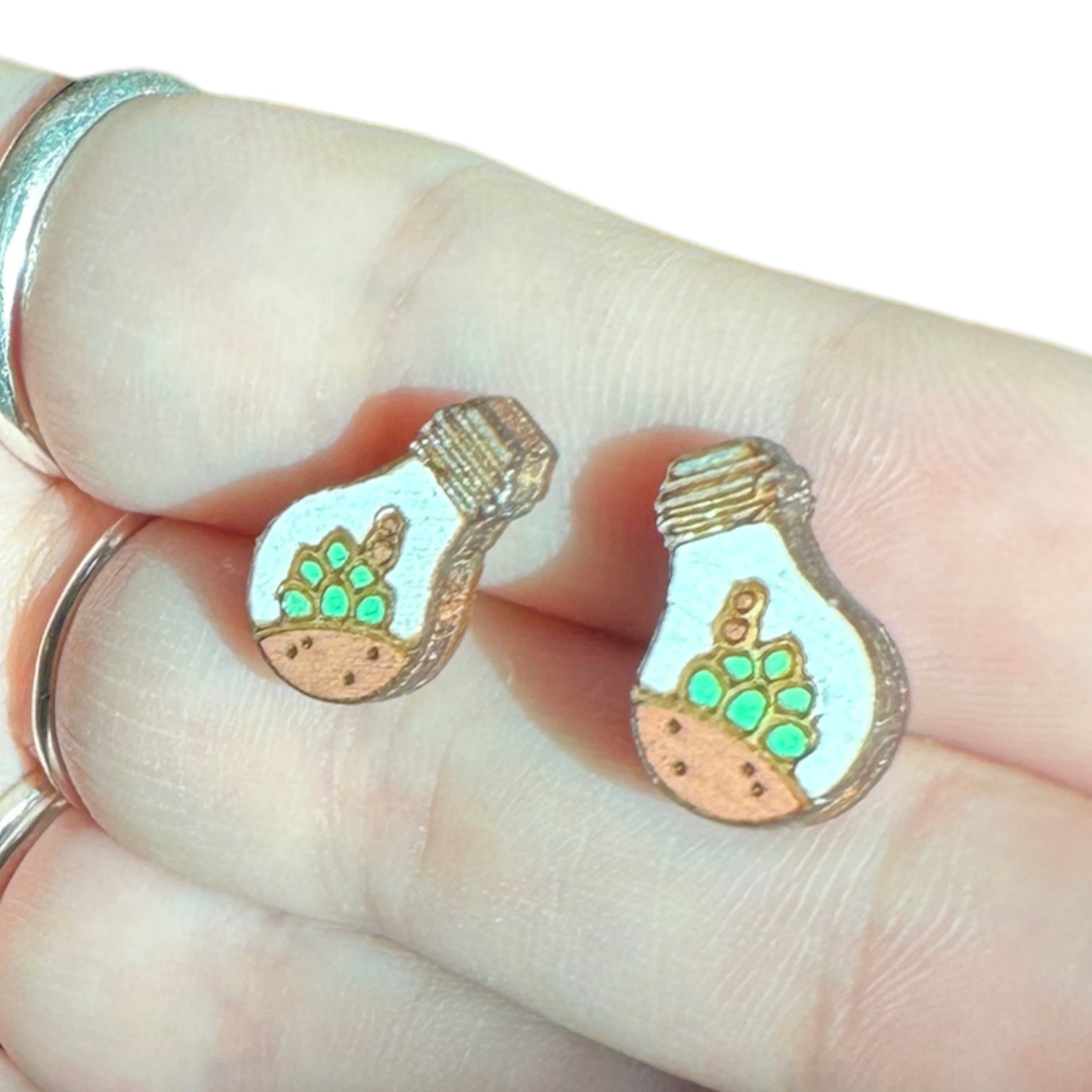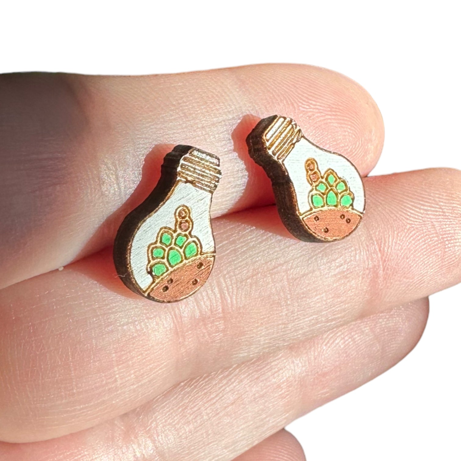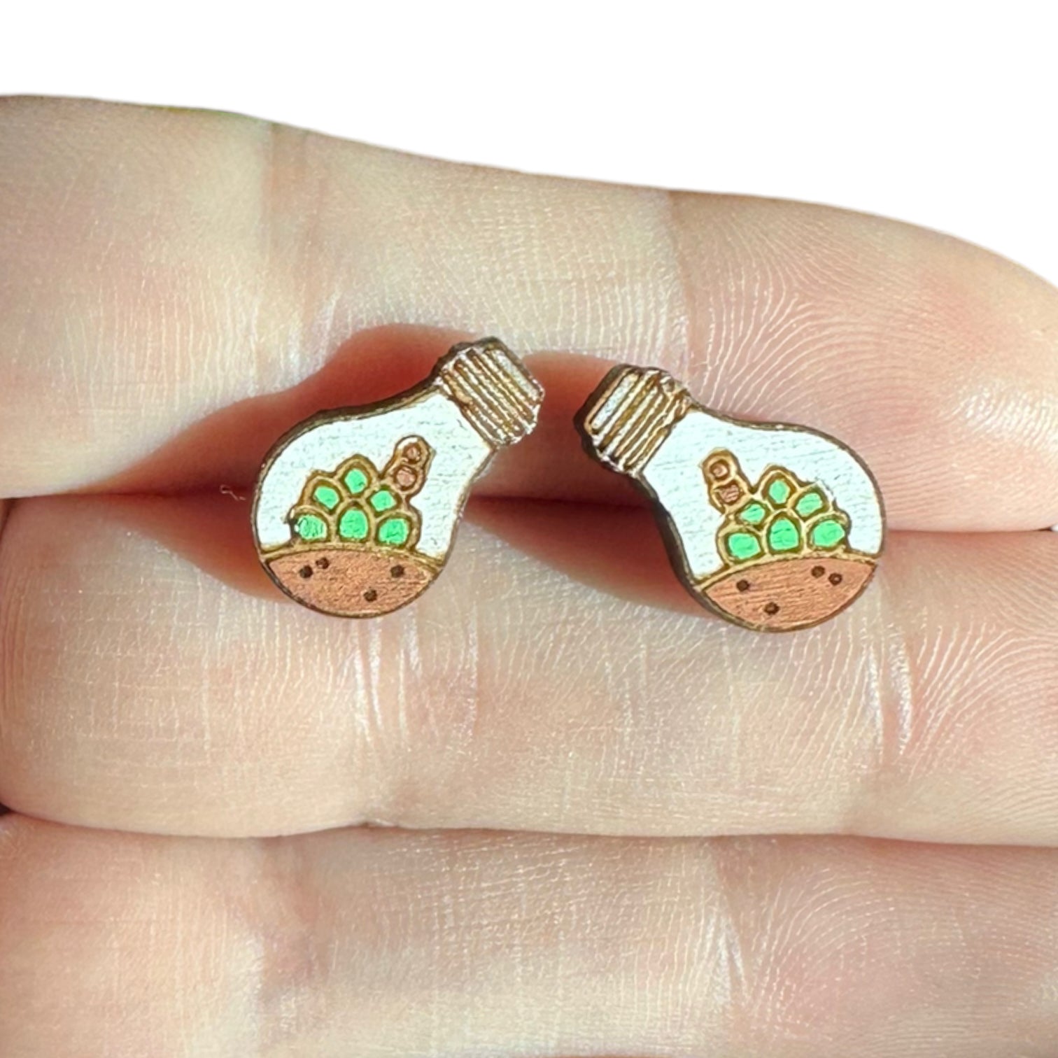 Hypoallergenic Hand Painted Light Bulb Succulent Laser Engraved Wood Stud Earrings