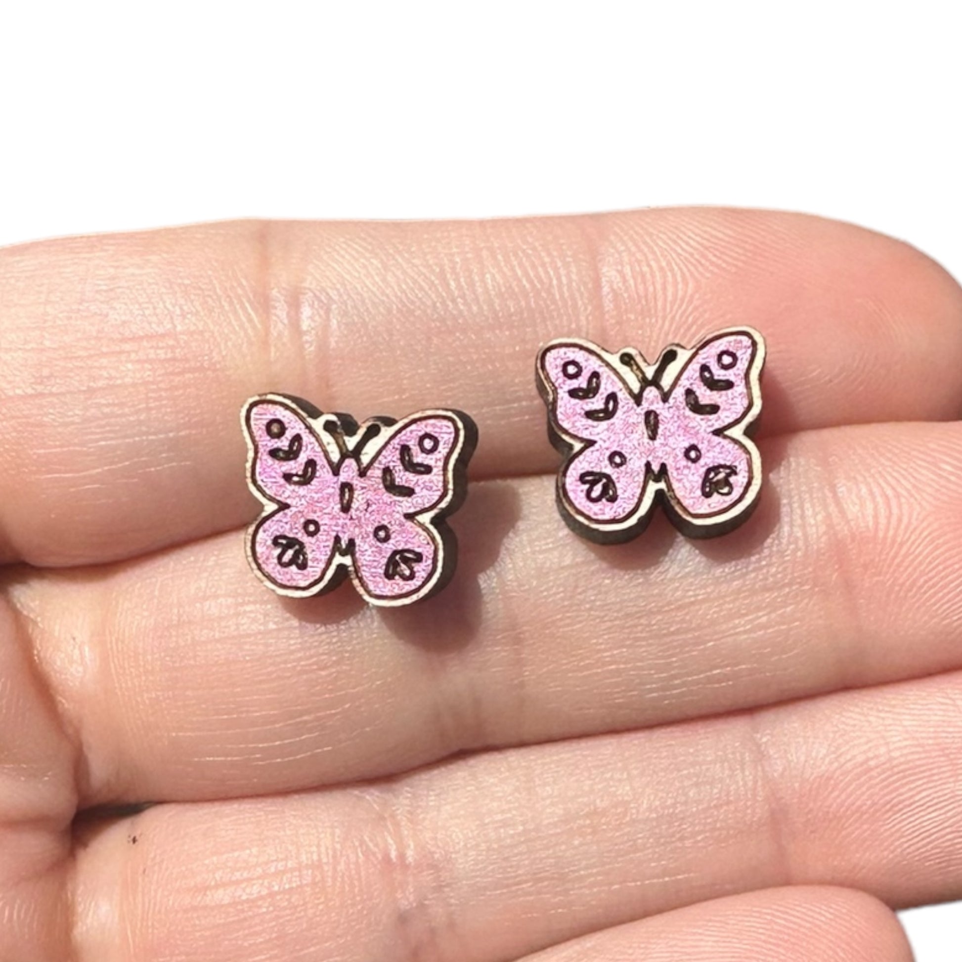 Hypoallergenic Hand Painted Metallic Purple Butterfly Laser Engraved Wood Stud Earrings
