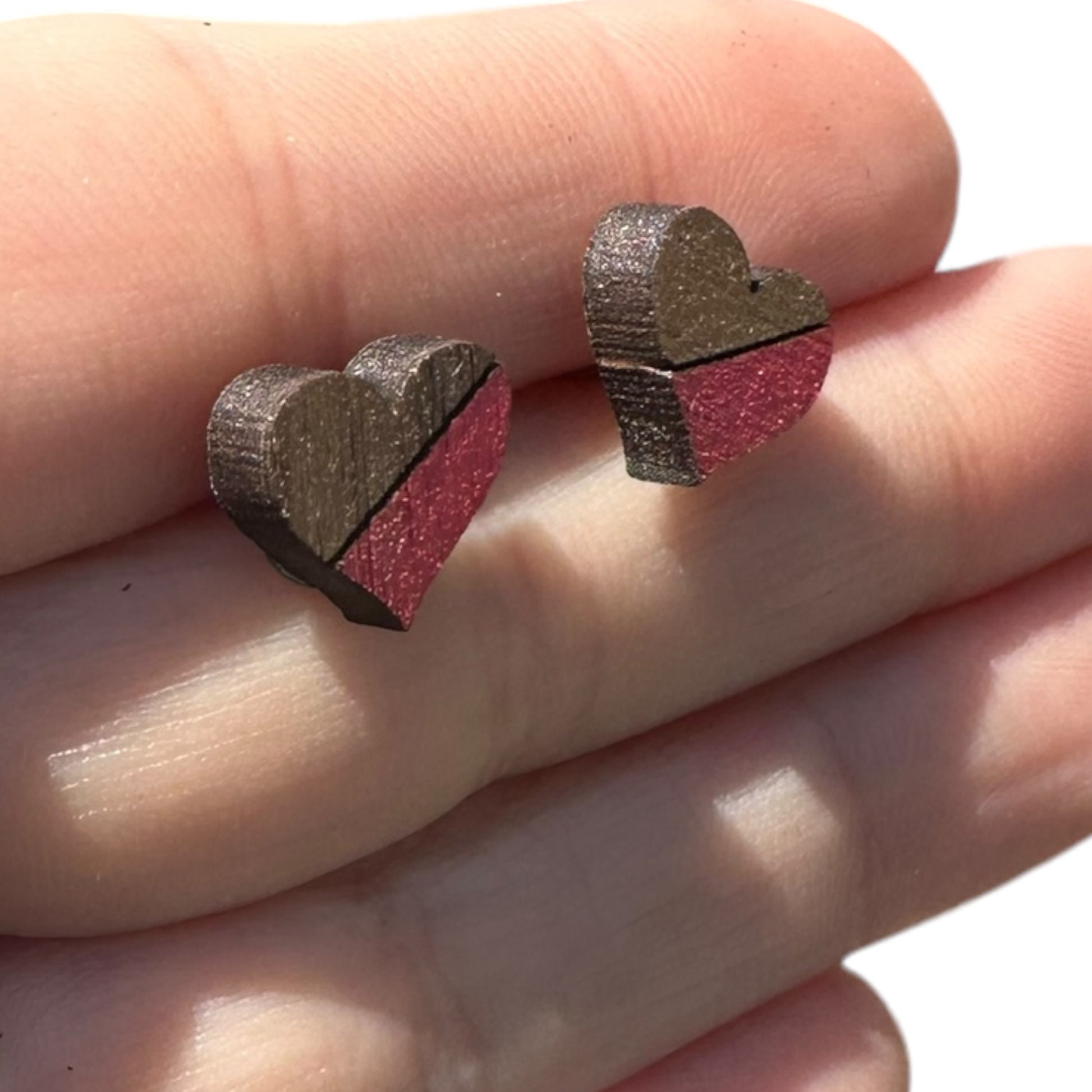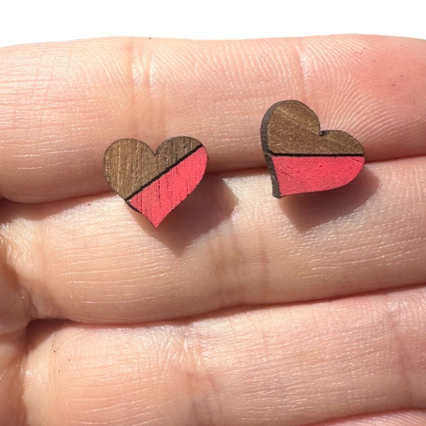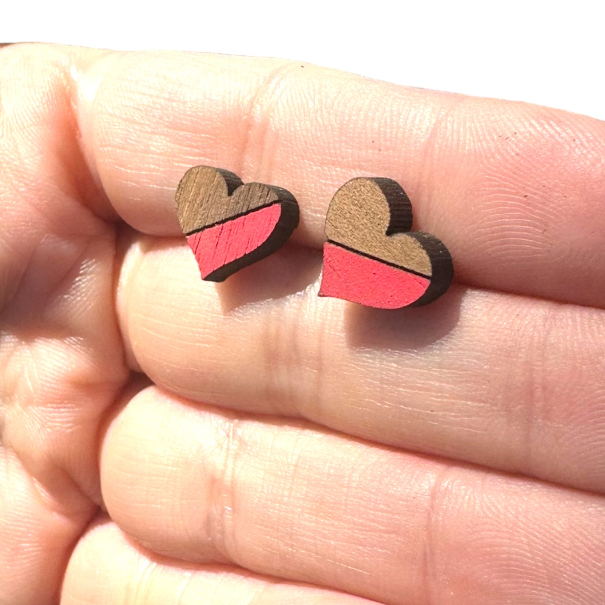 Hypoallergenic Hand Painted Red Heart Laser Engraved Wood Stud Earrings