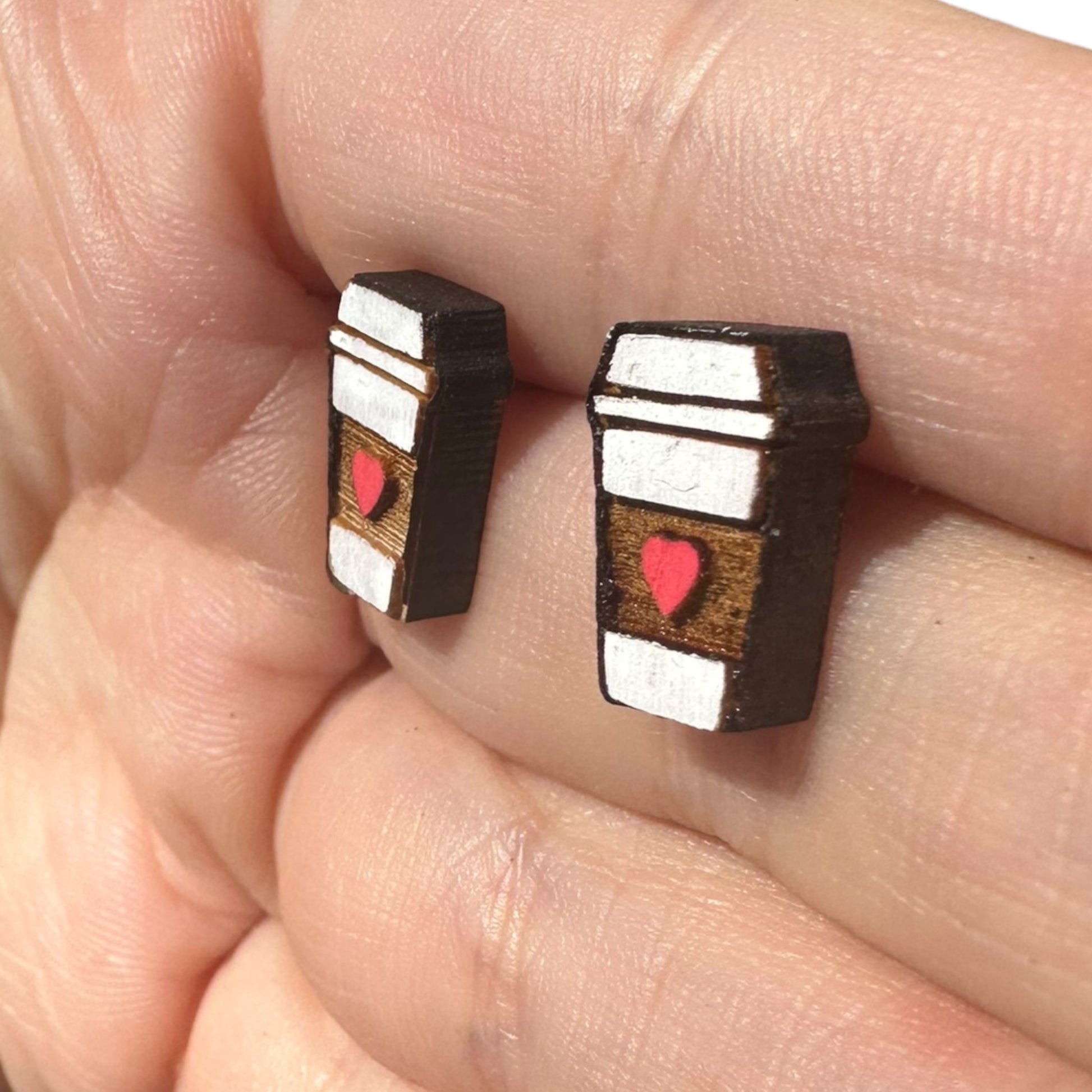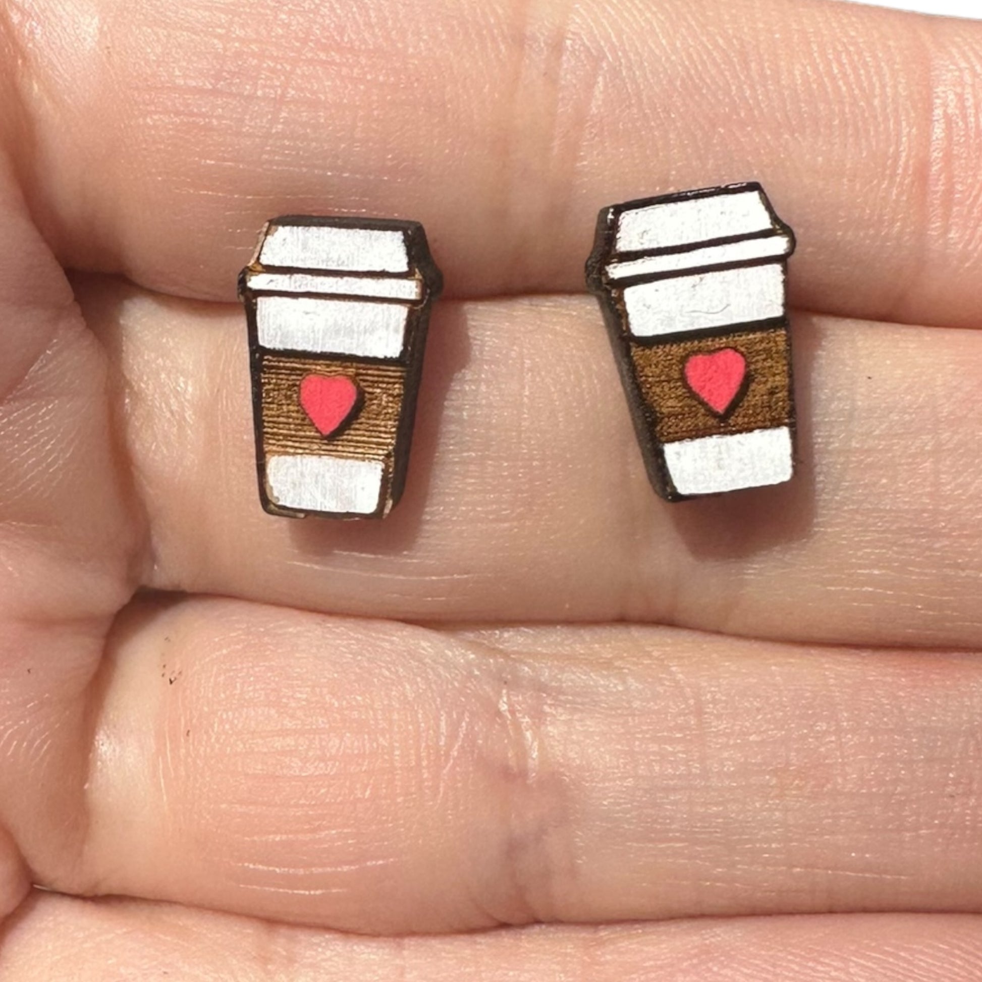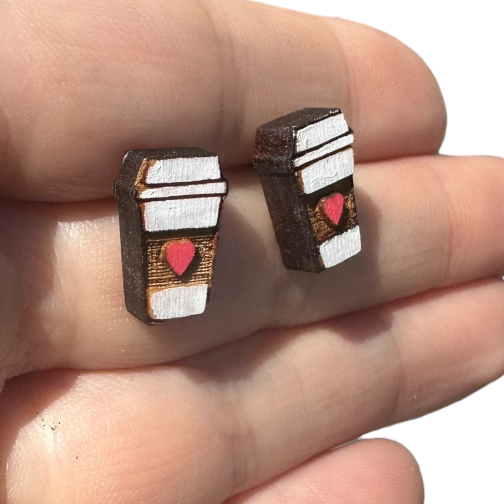 Hypoallergenic Hand Painted Starbucks Cup with Heart Laser Engraved Wood Stud Earrings