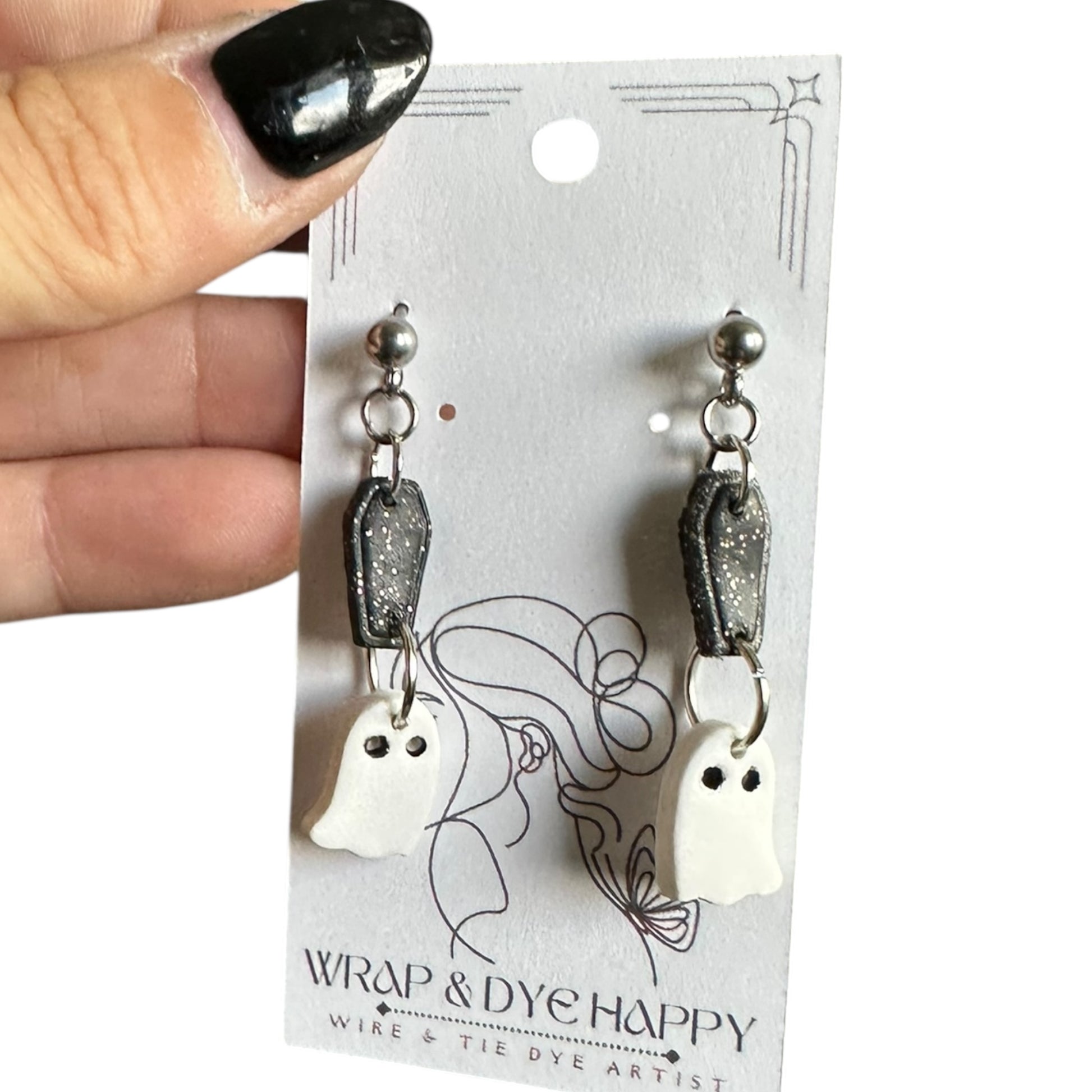 Hypoallergenic Hanging Coffin and Ghost Clay Dangle Earrings