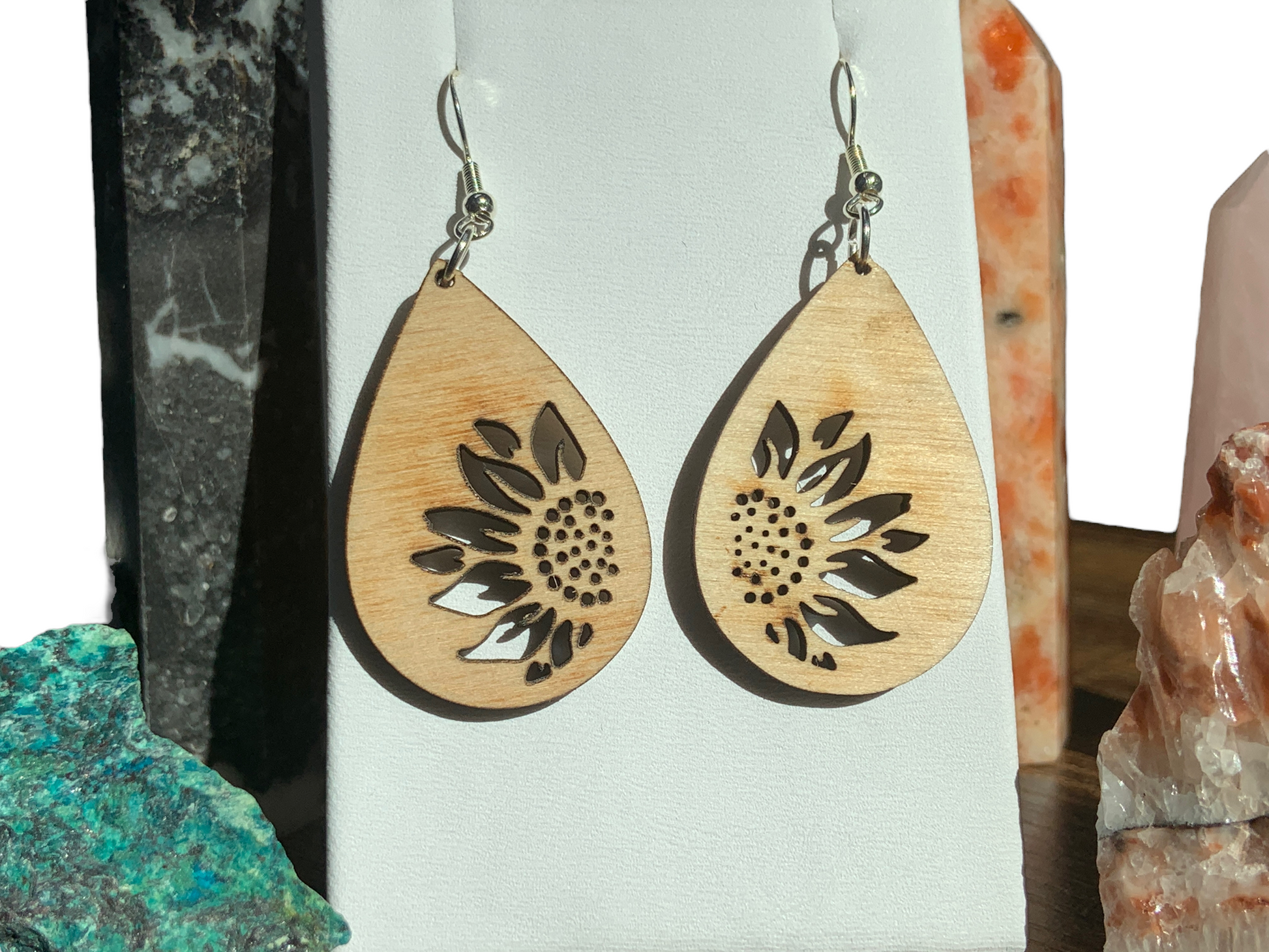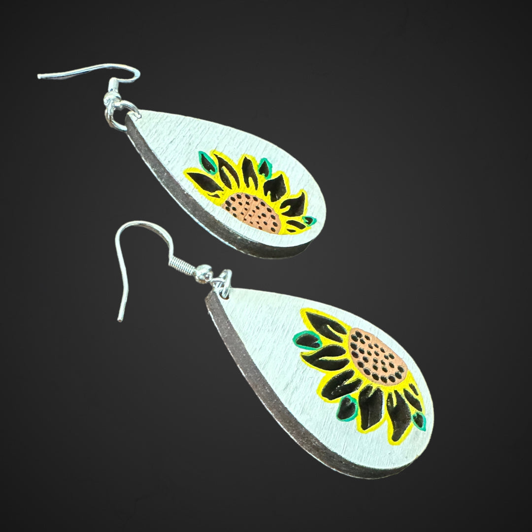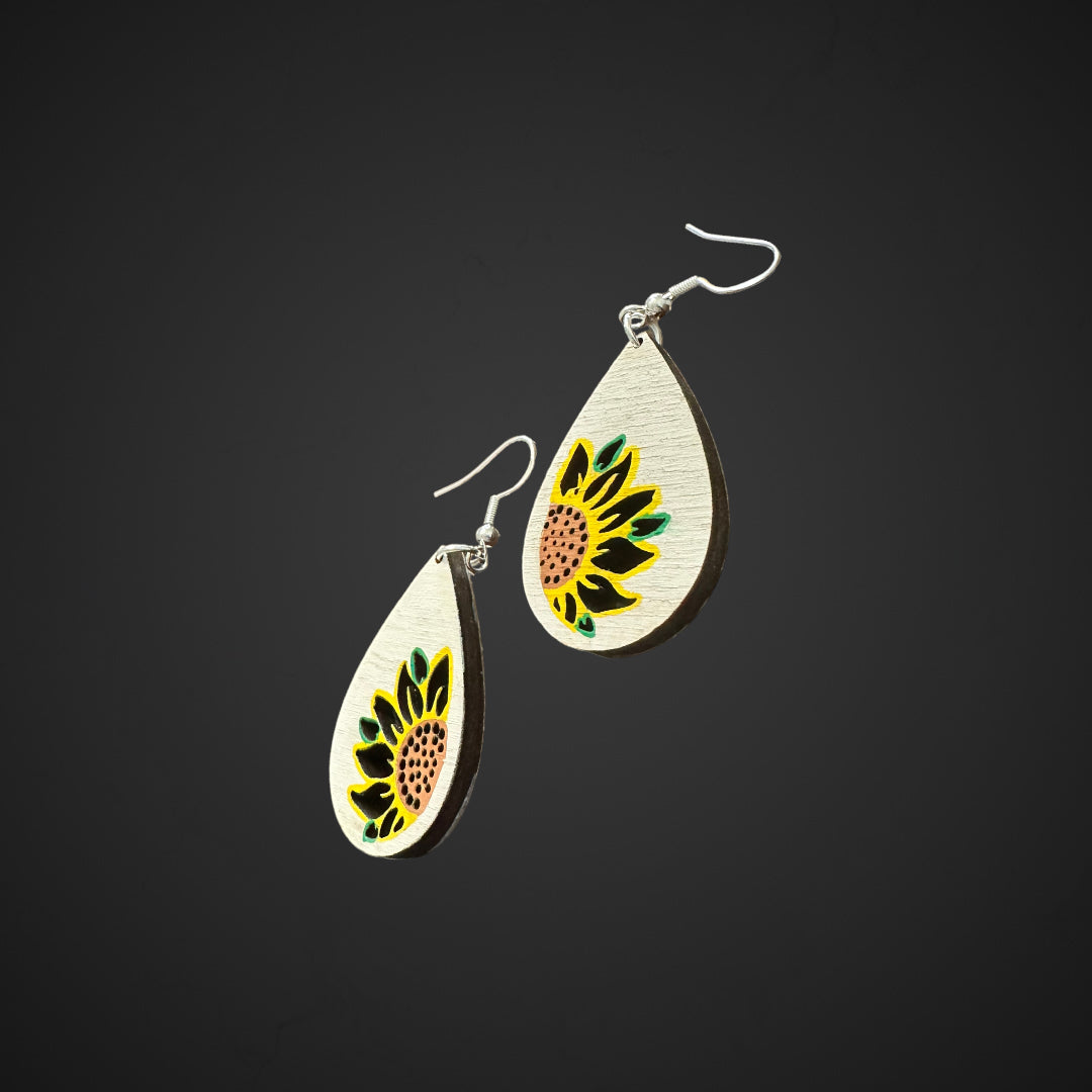 Painted | Natural Wood Hypoallergenic Teardrop Sunflower Wood Laser Engraved Wood Earrings