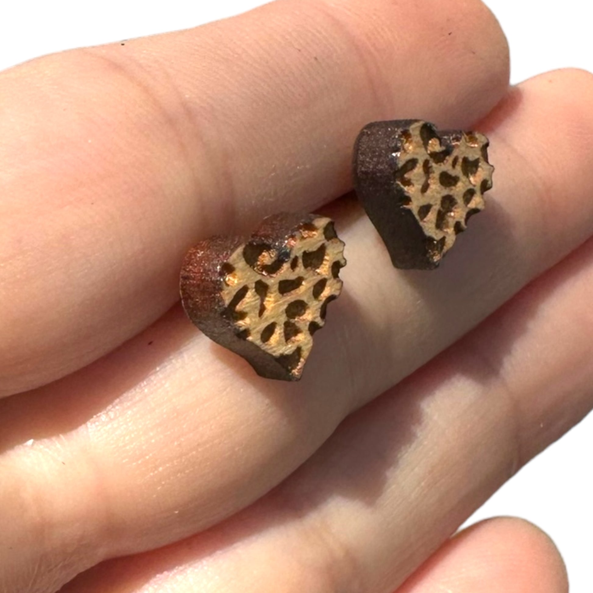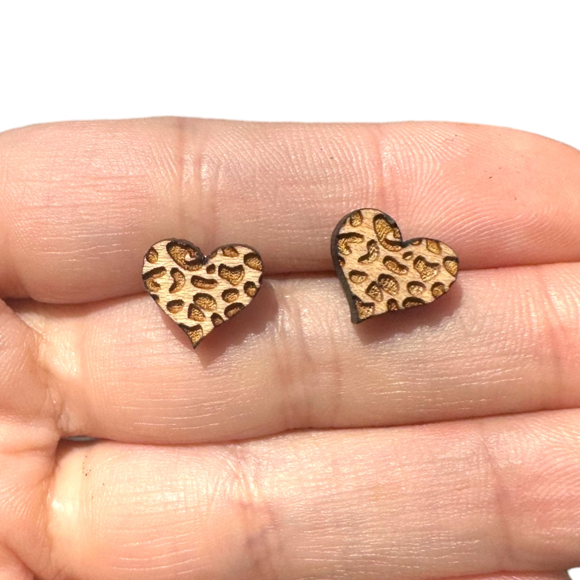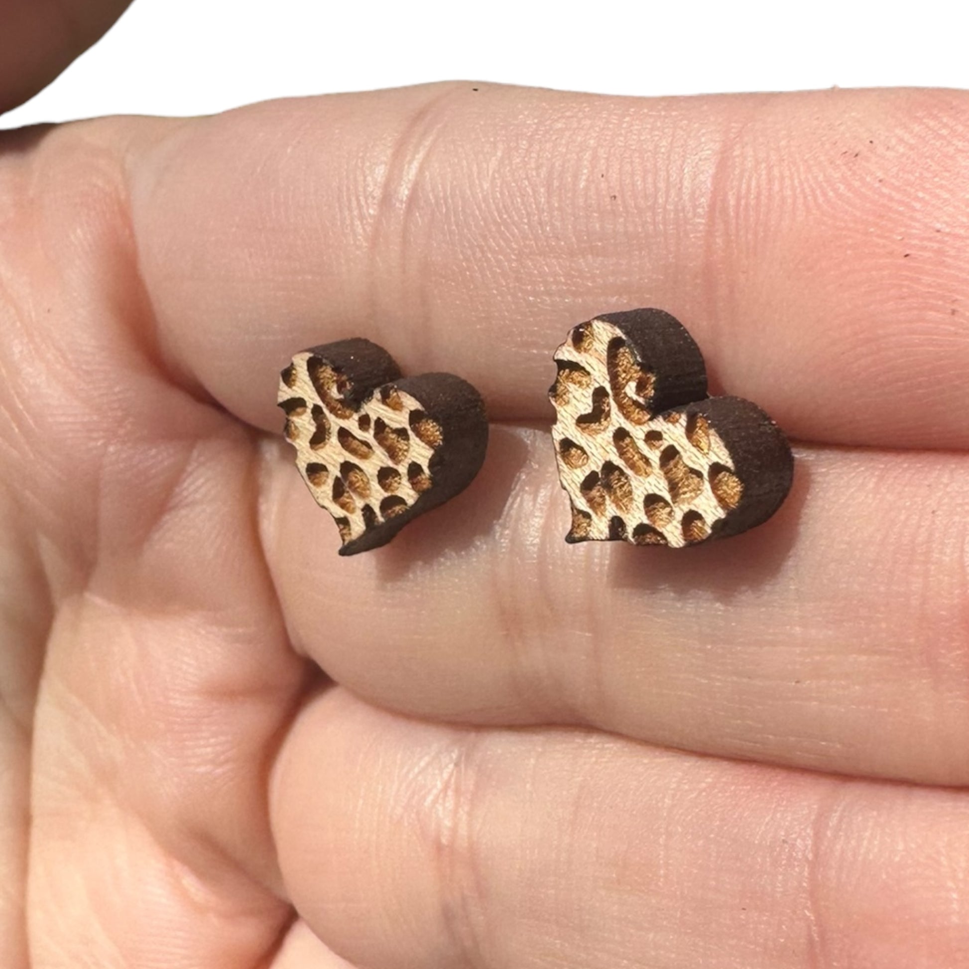 Natural Hypoallergenic Leopard Heart Wood Laser Engraved Wood Earrings