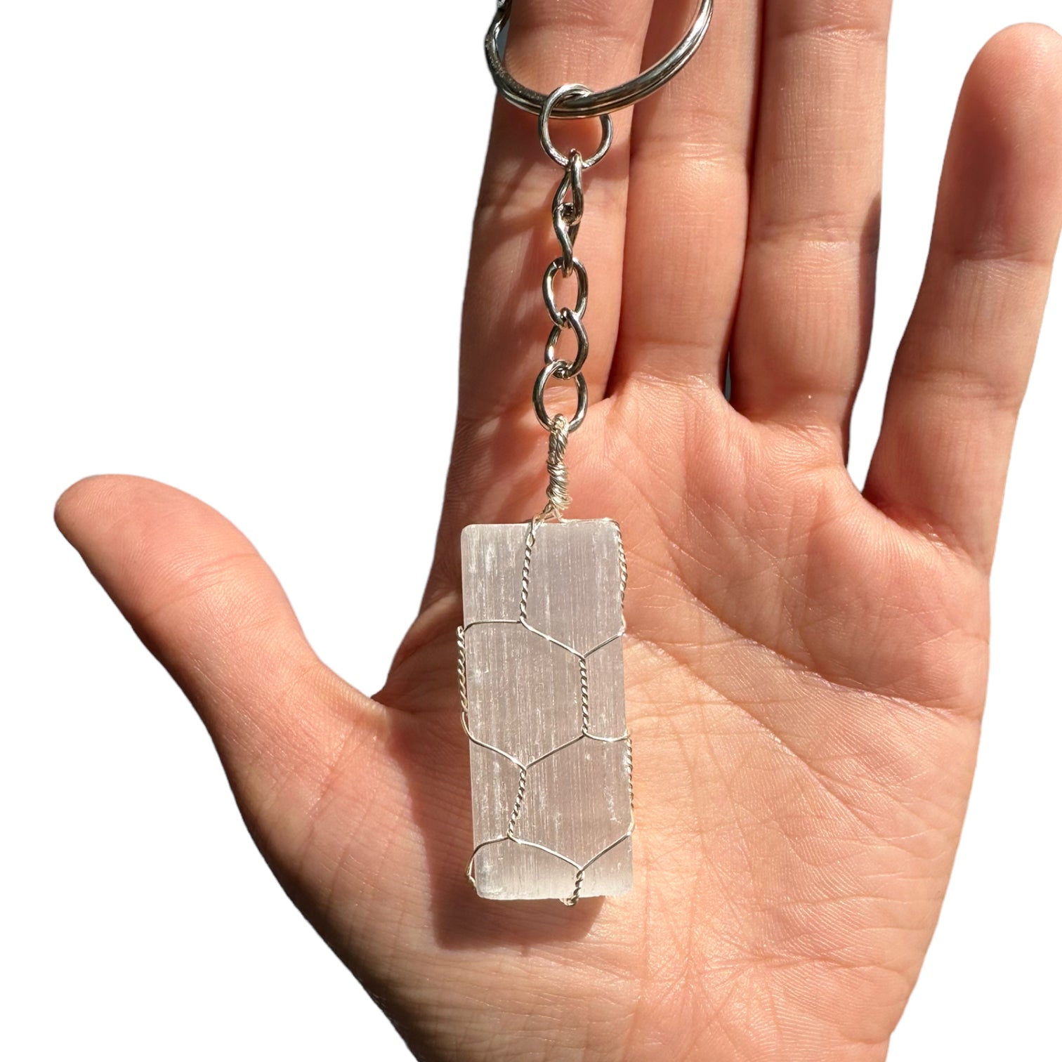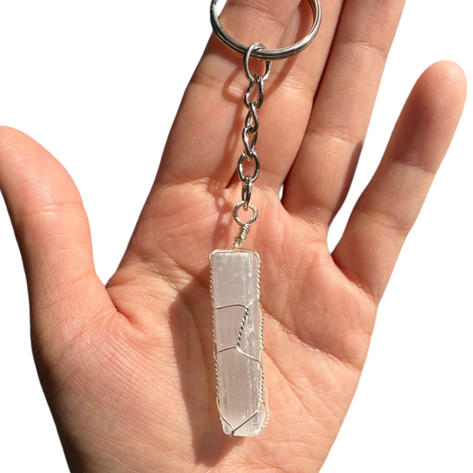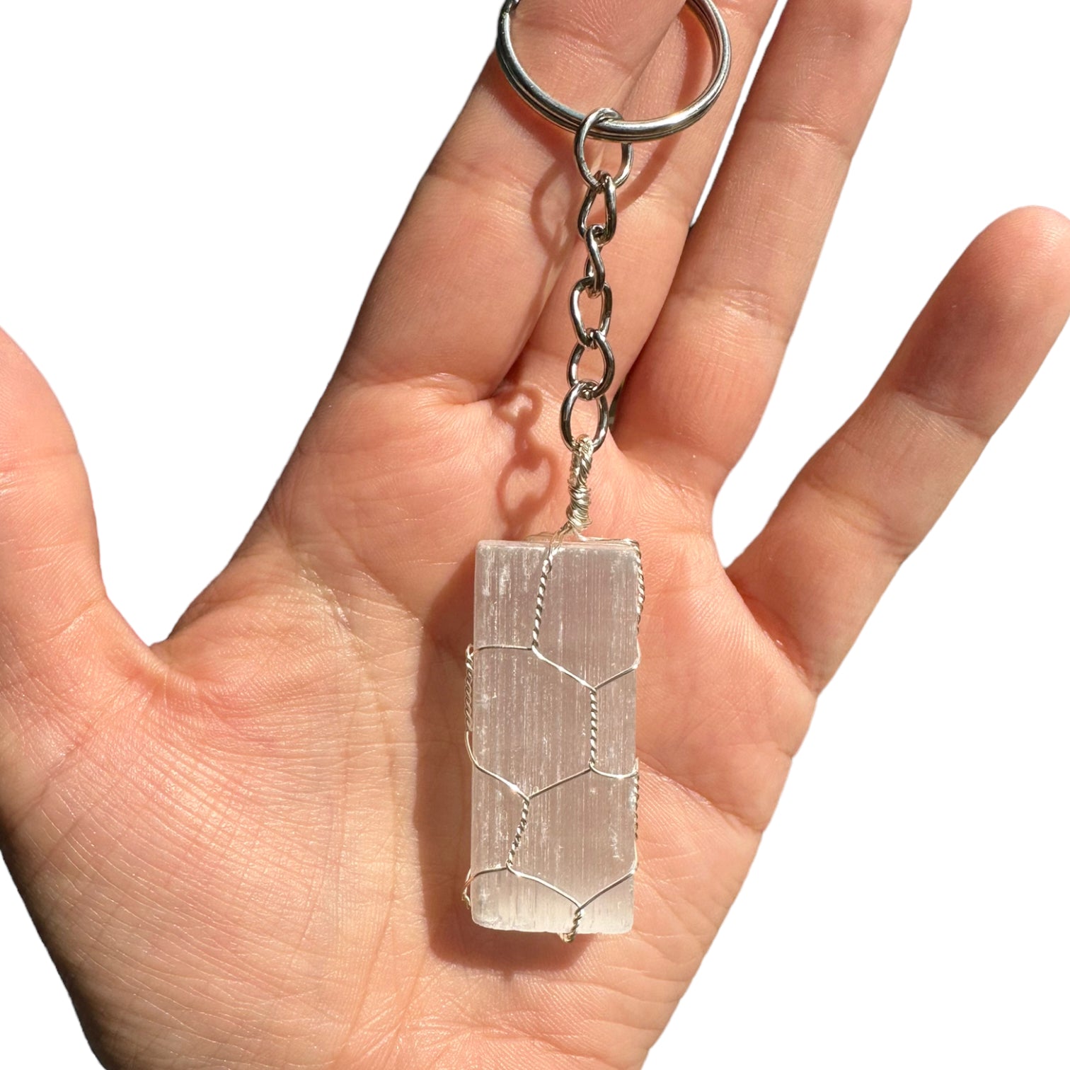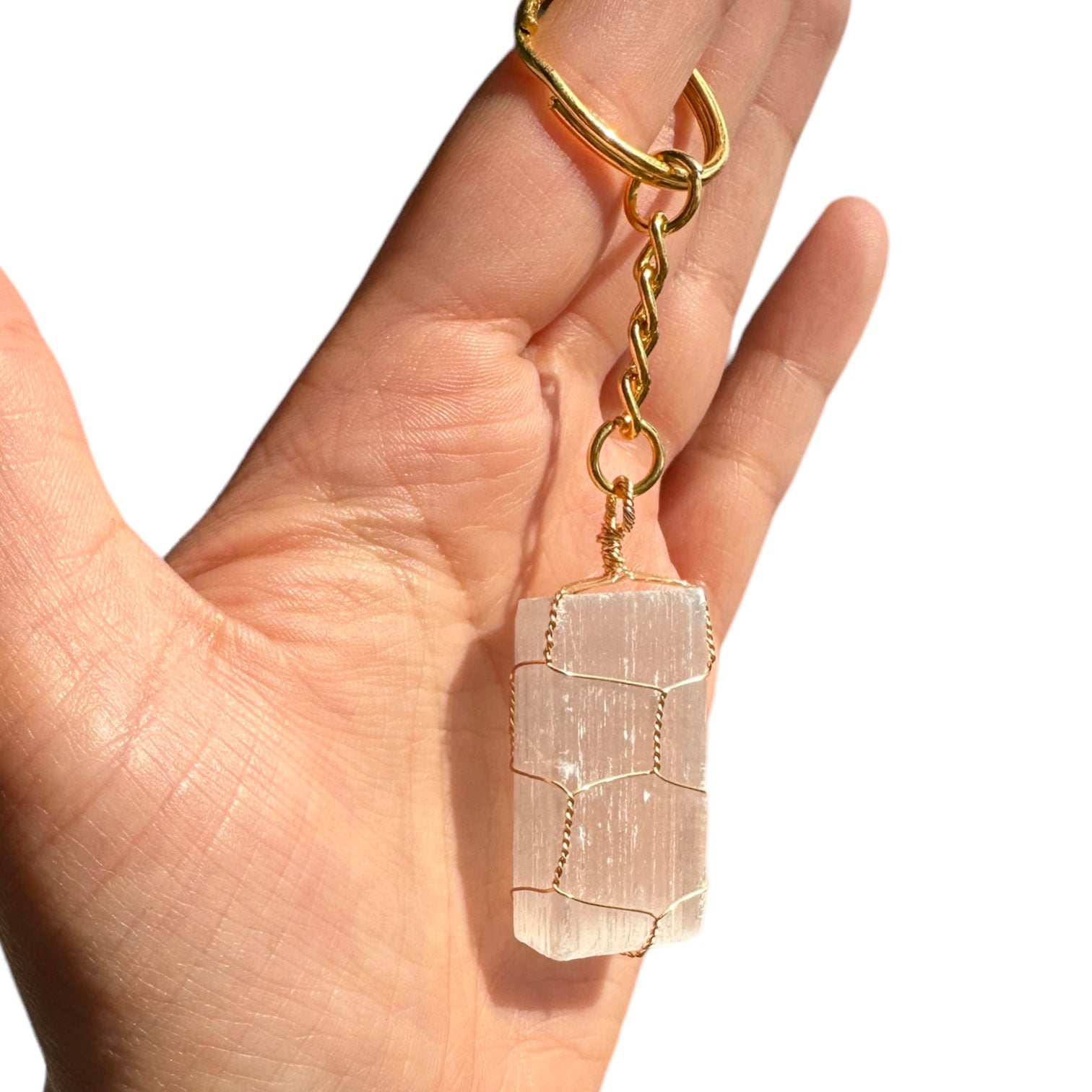 Silver | Gold Wire Wrapped Selenite Crystal Keychain
