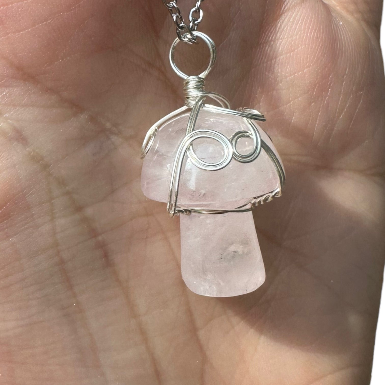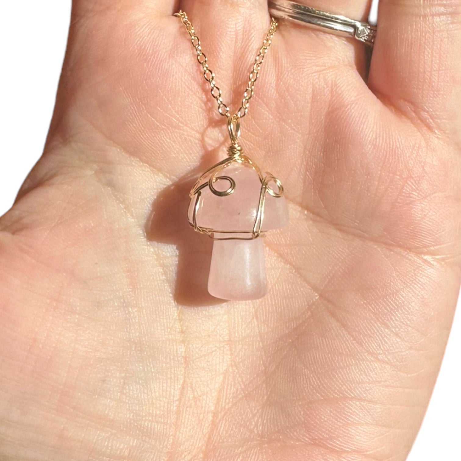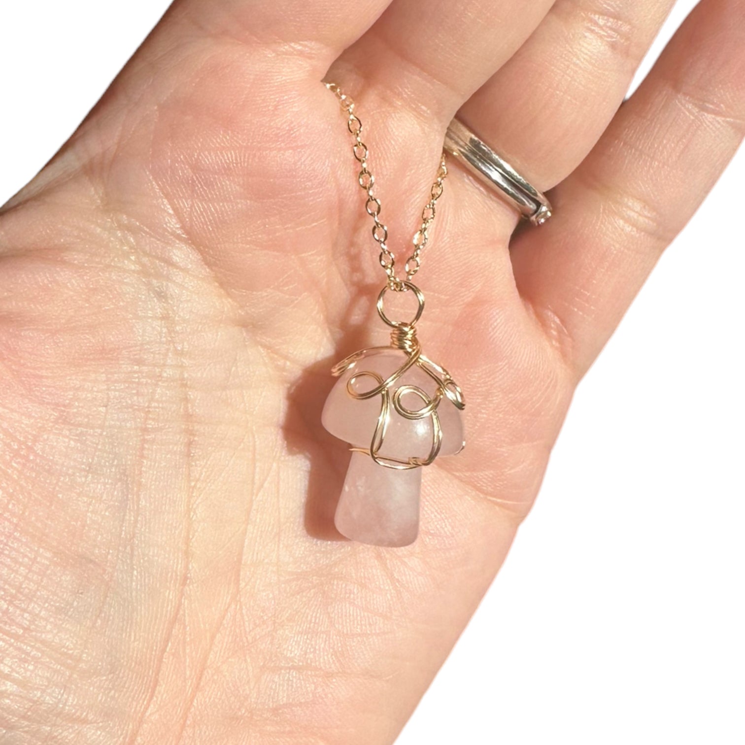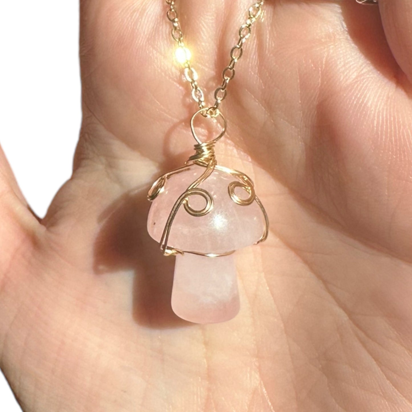 Sterling Silver | 14KT Gold Filled Wire Wrapped Rose Quartz Crystal Mushroom Pendant