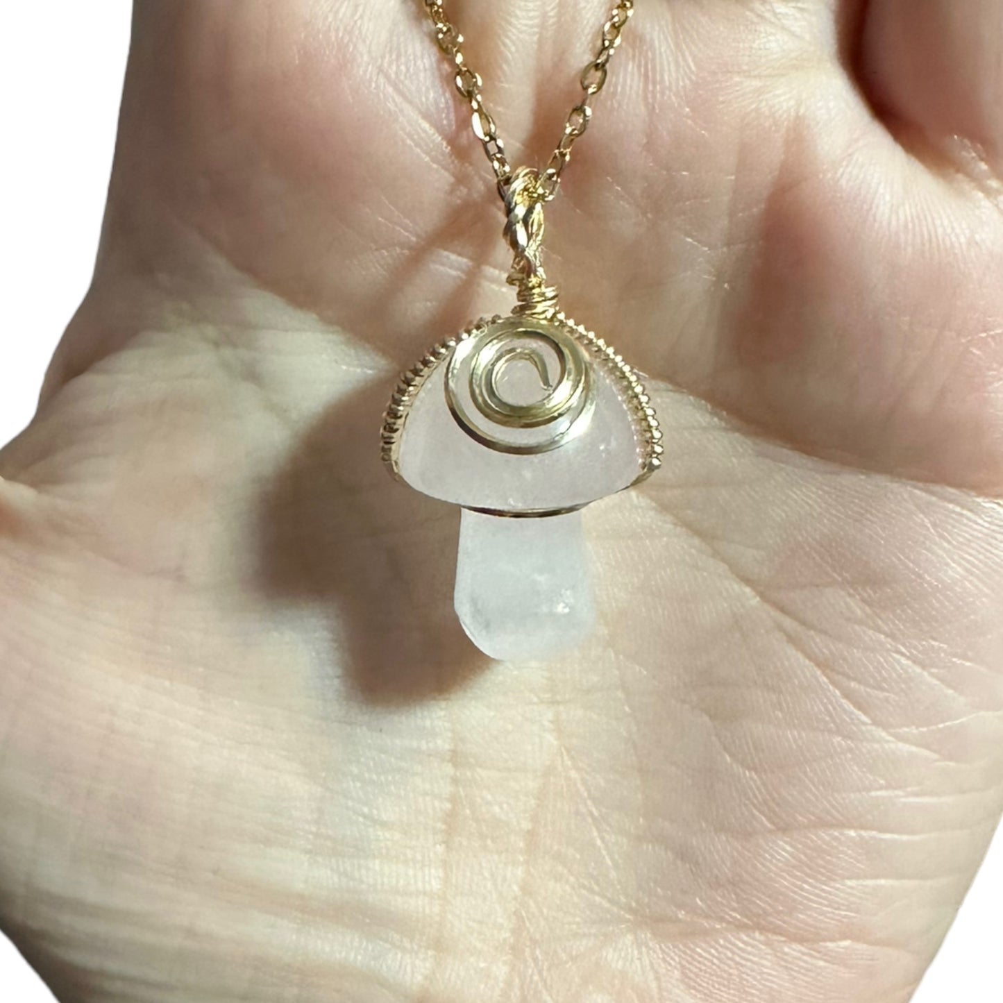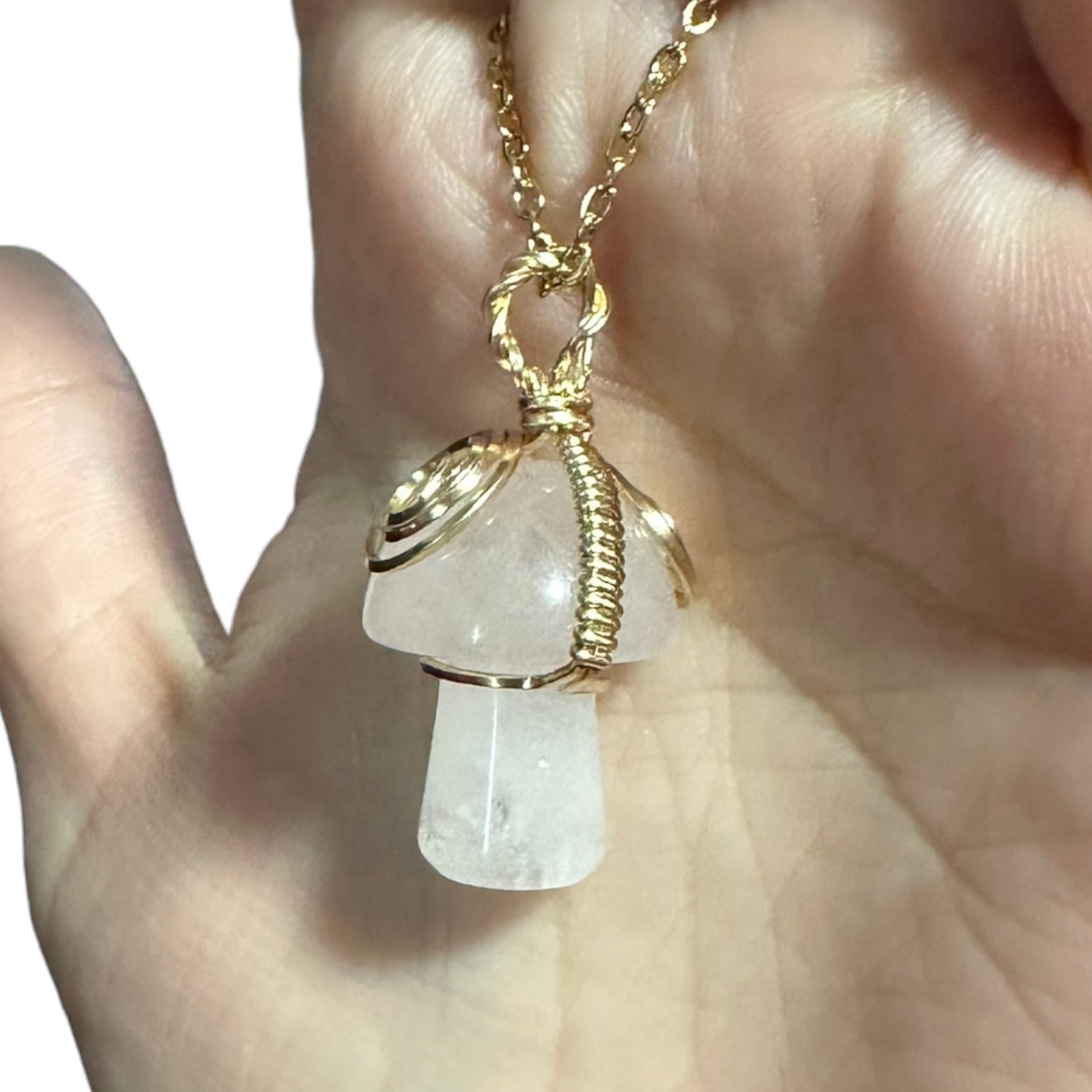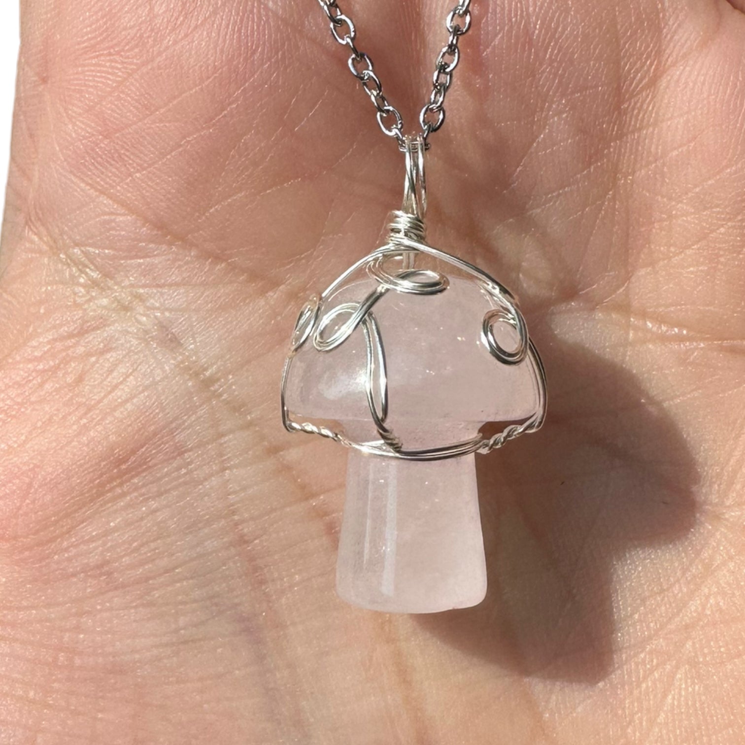 Sterling Silver | 14KT Gold Filled Wire Wrapped Rose Quartz Crystal Mushroom Pendant