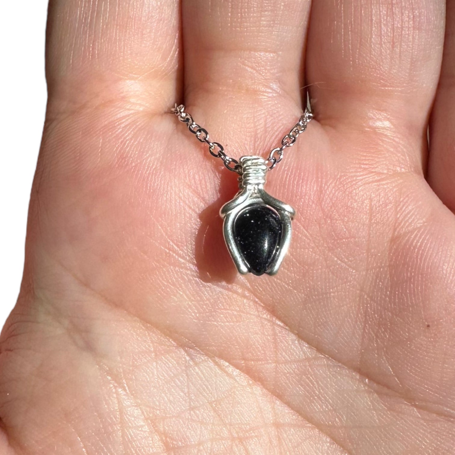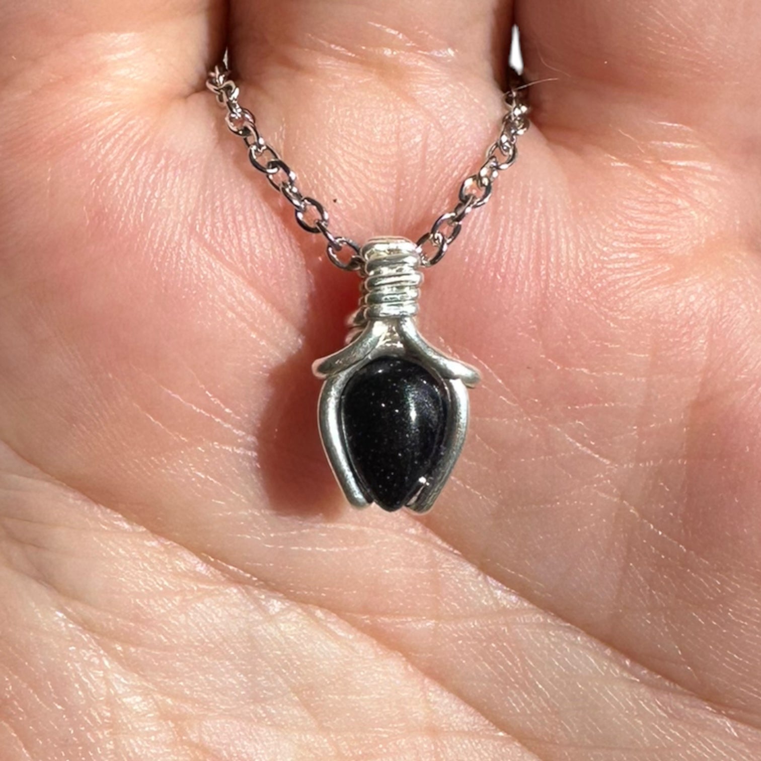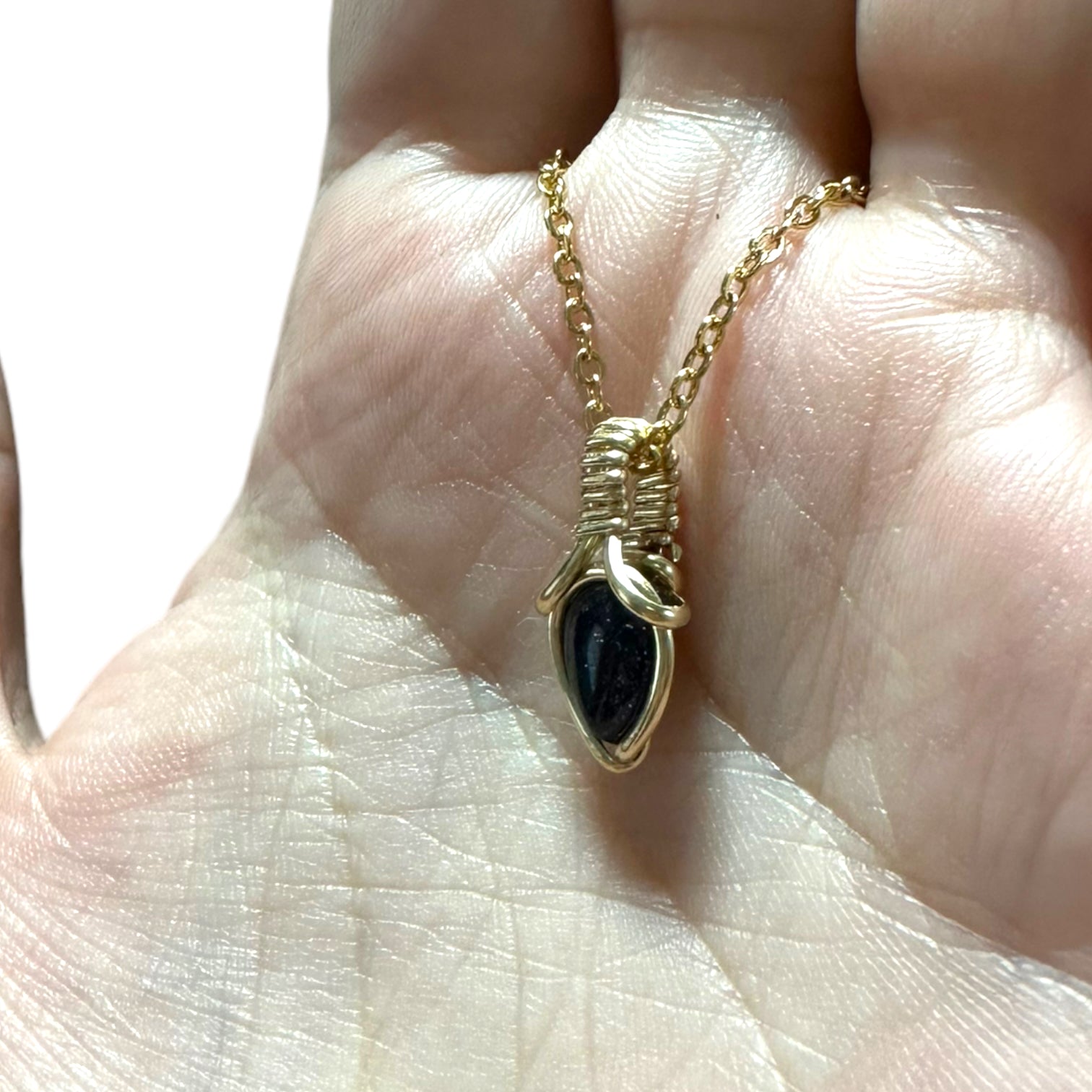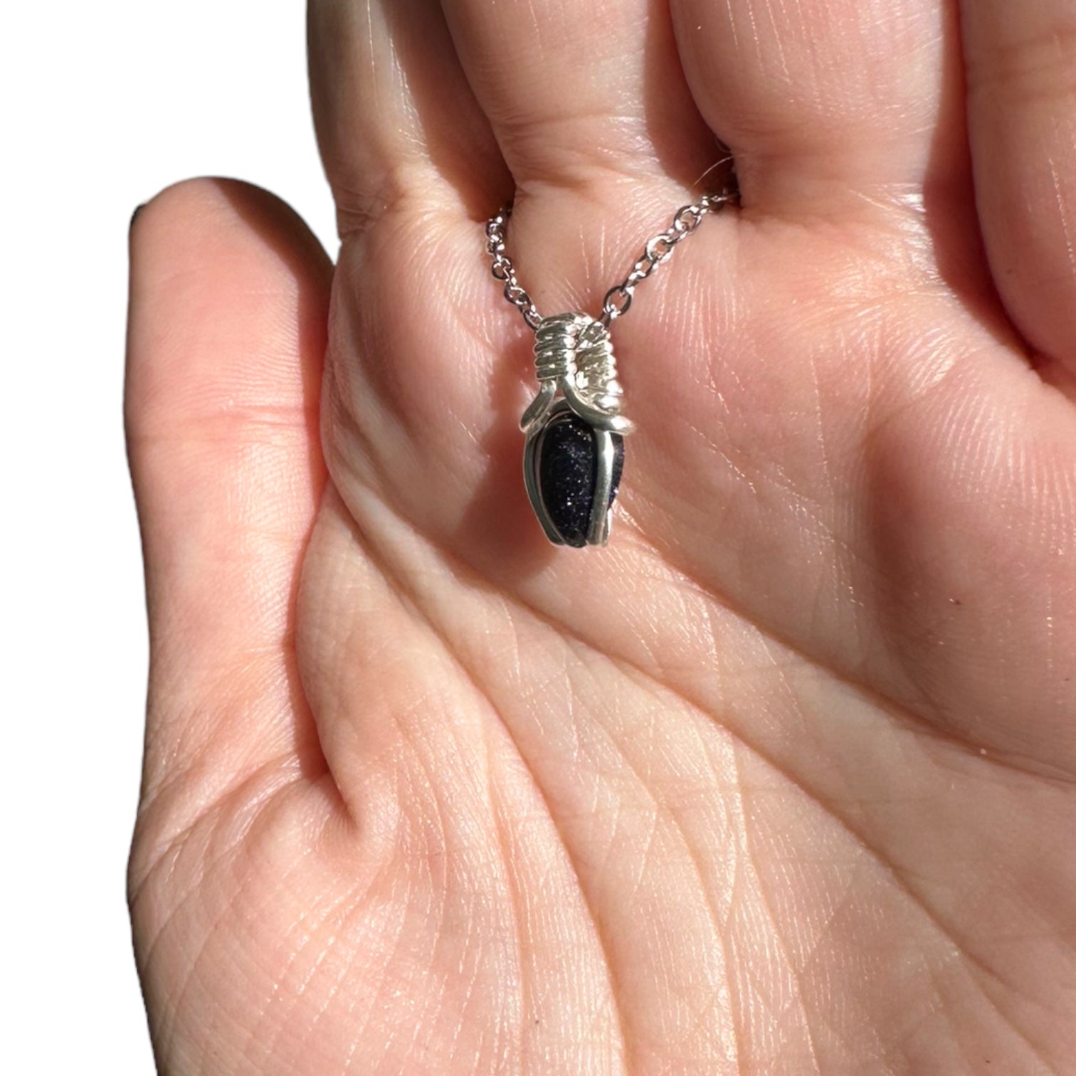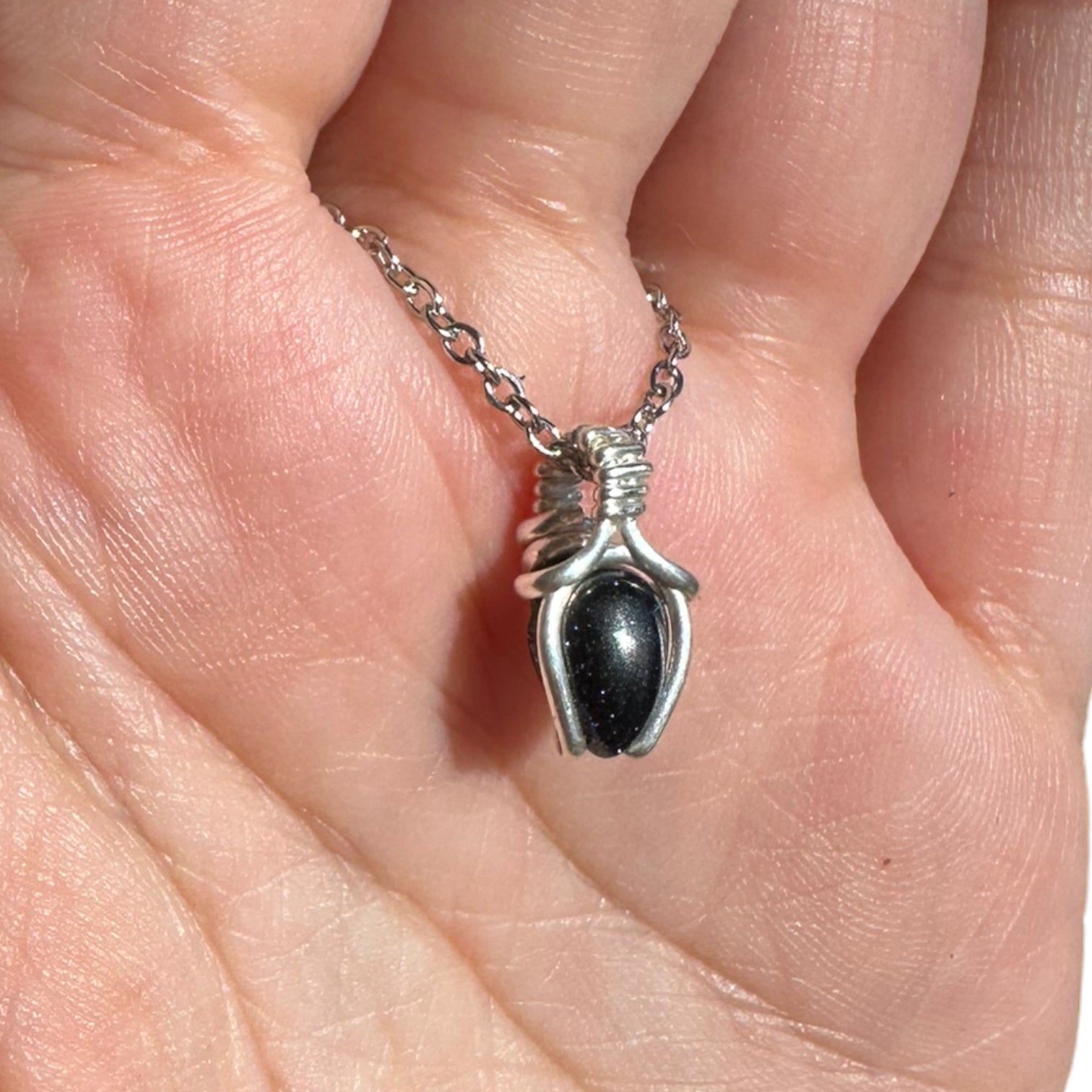 Sterling Silver | 14KT Gold Filled Mini Teardrop Blue Goldstone Wire Wrapped Wishbone Pendant