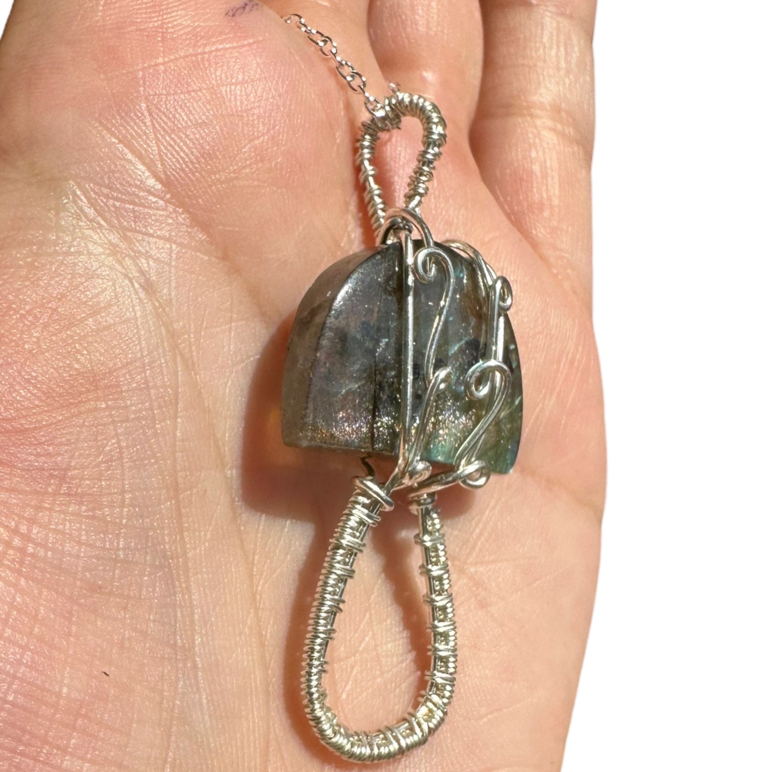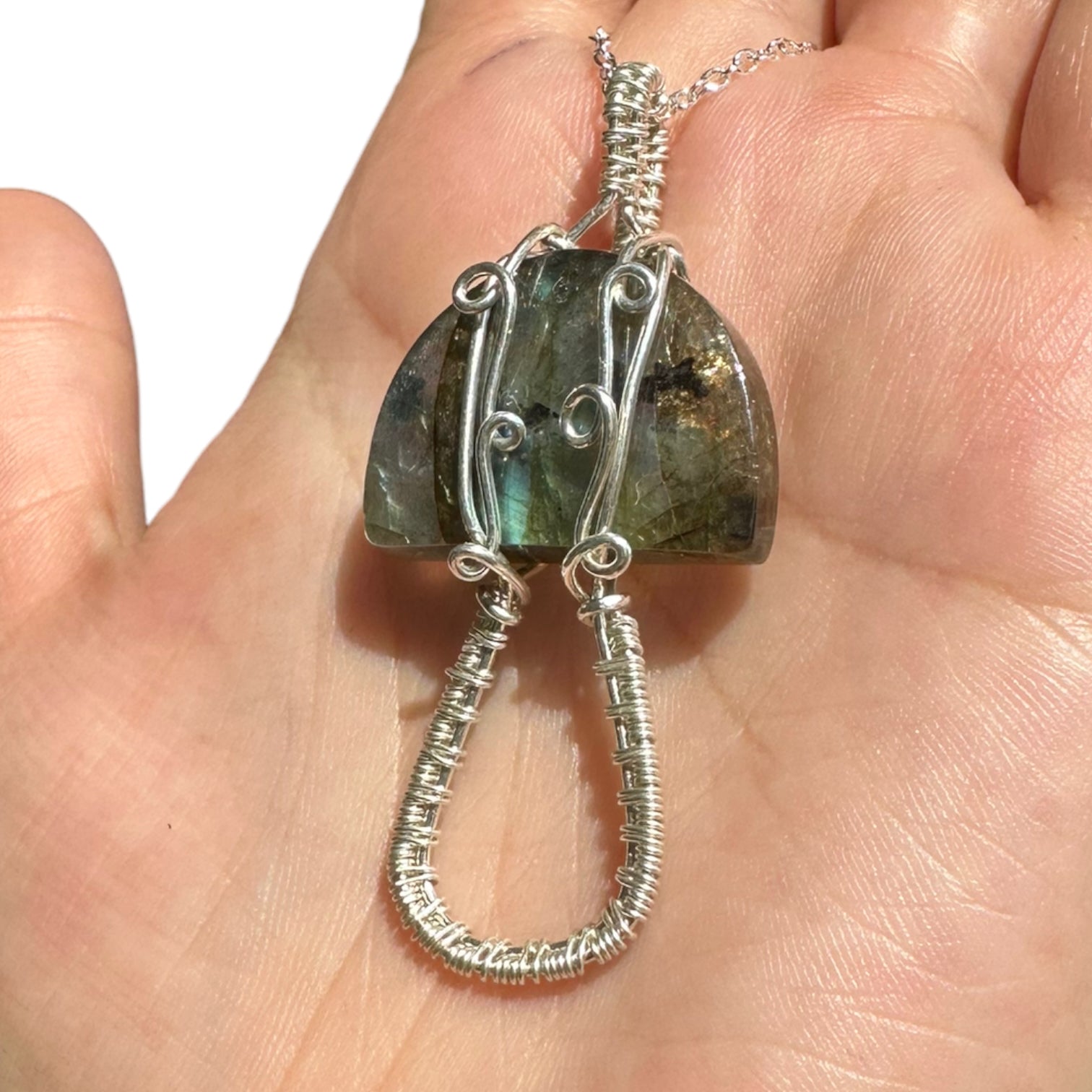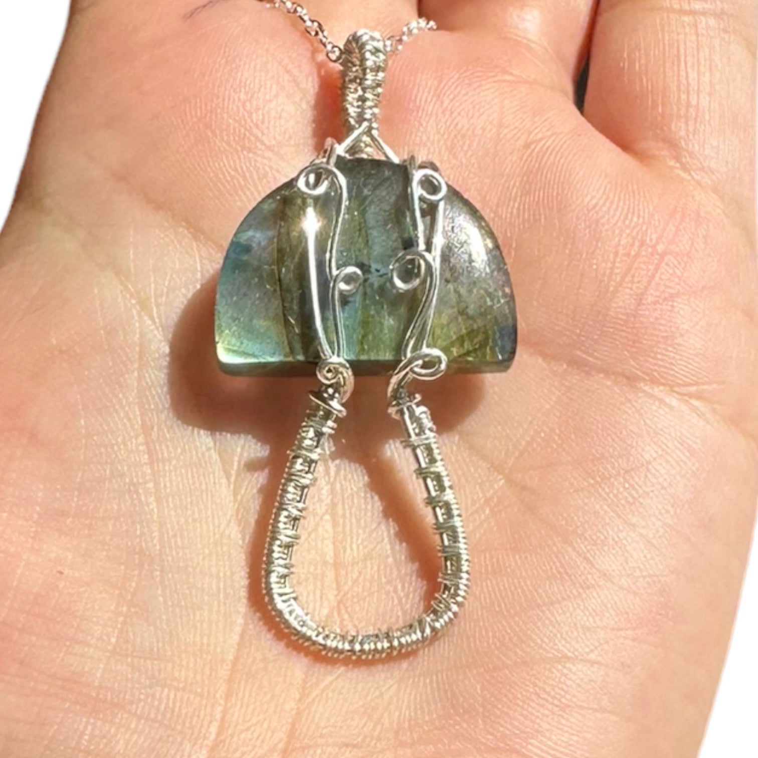 Sterling Silver Wire Wrapped Full Flash Labradorite Top Crystal Mushroom Pendant