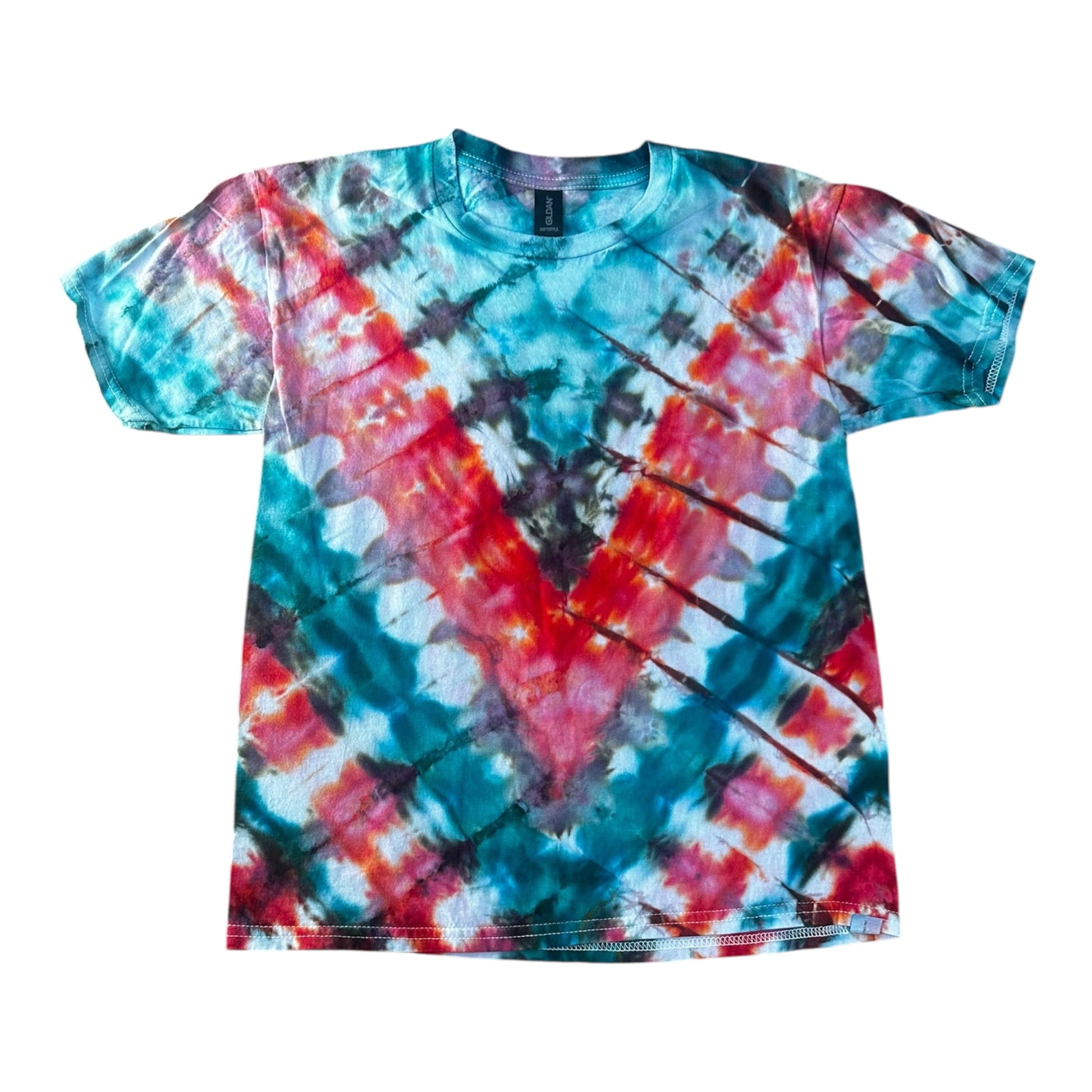 Youth Large Red Gray and Teal V Pleated Ice Dye Tie Dye T-Shirt