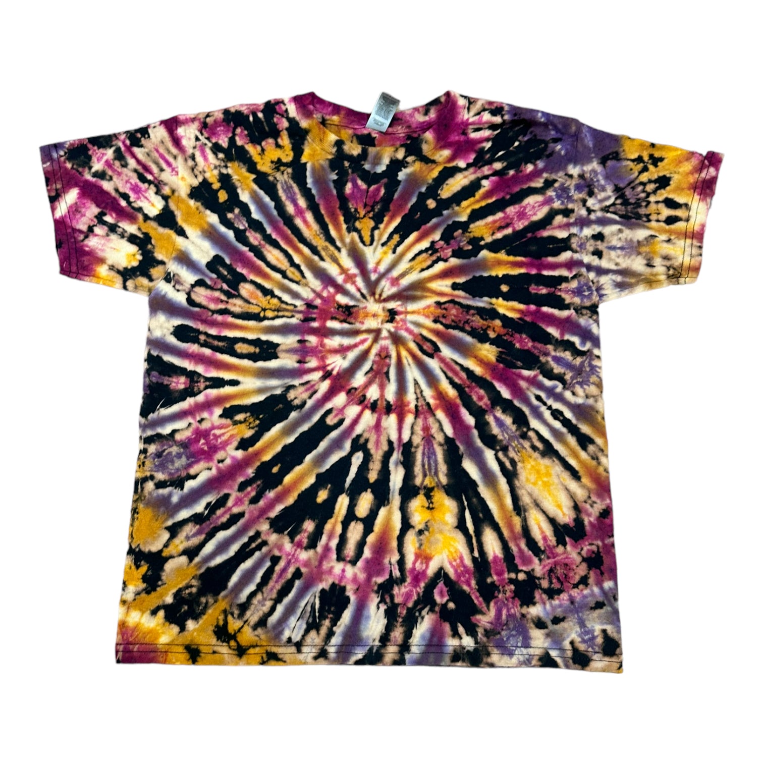 I hand dye all my tie dye clothing.  I wash the shirts in a solution to help prep the shirt and remove all of the fire protectant and residue. I then soak in a solution to prep the shirt for dyeing and helps the dye adhere to the fabric.  I then twist the shirt into a design and dye.  The dye sits on the shirt for 24 hours give the best vibrant colors. I then wash In a special solution and dry to set the colors.