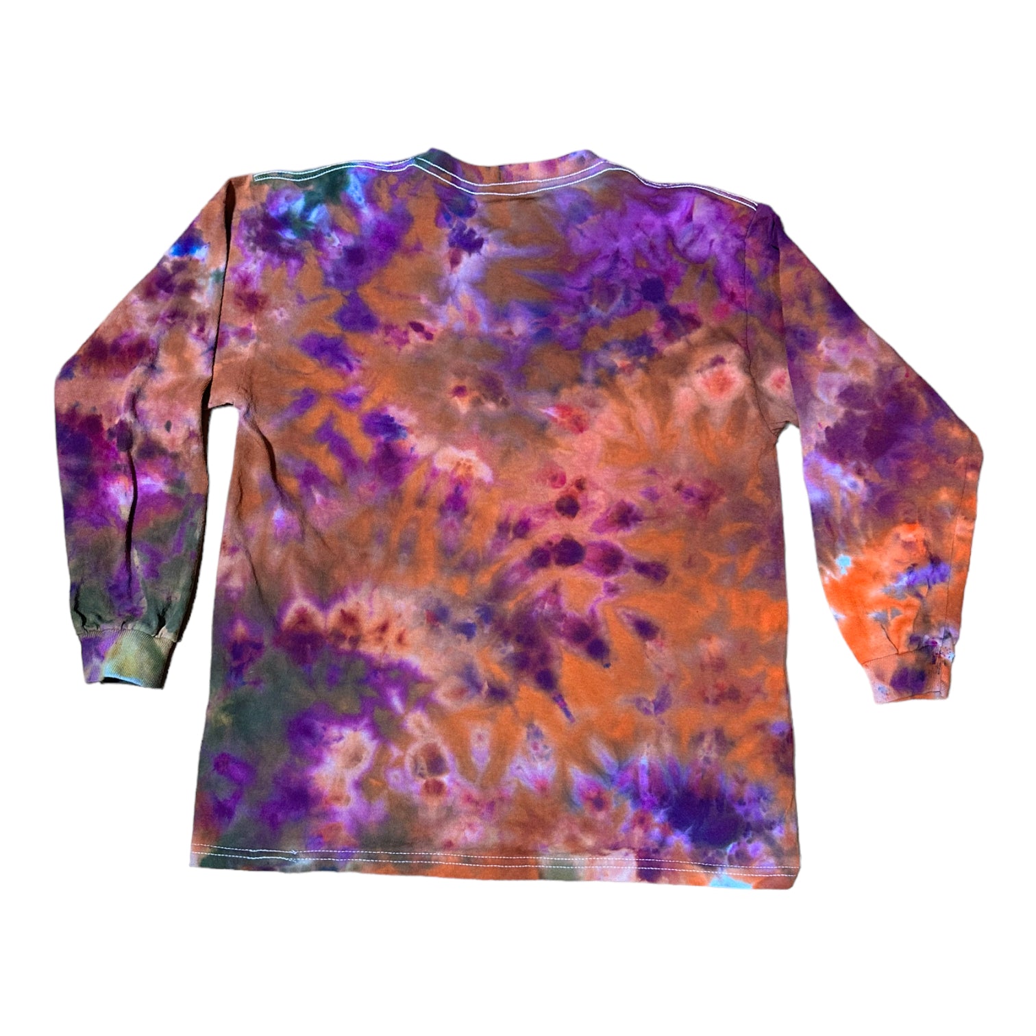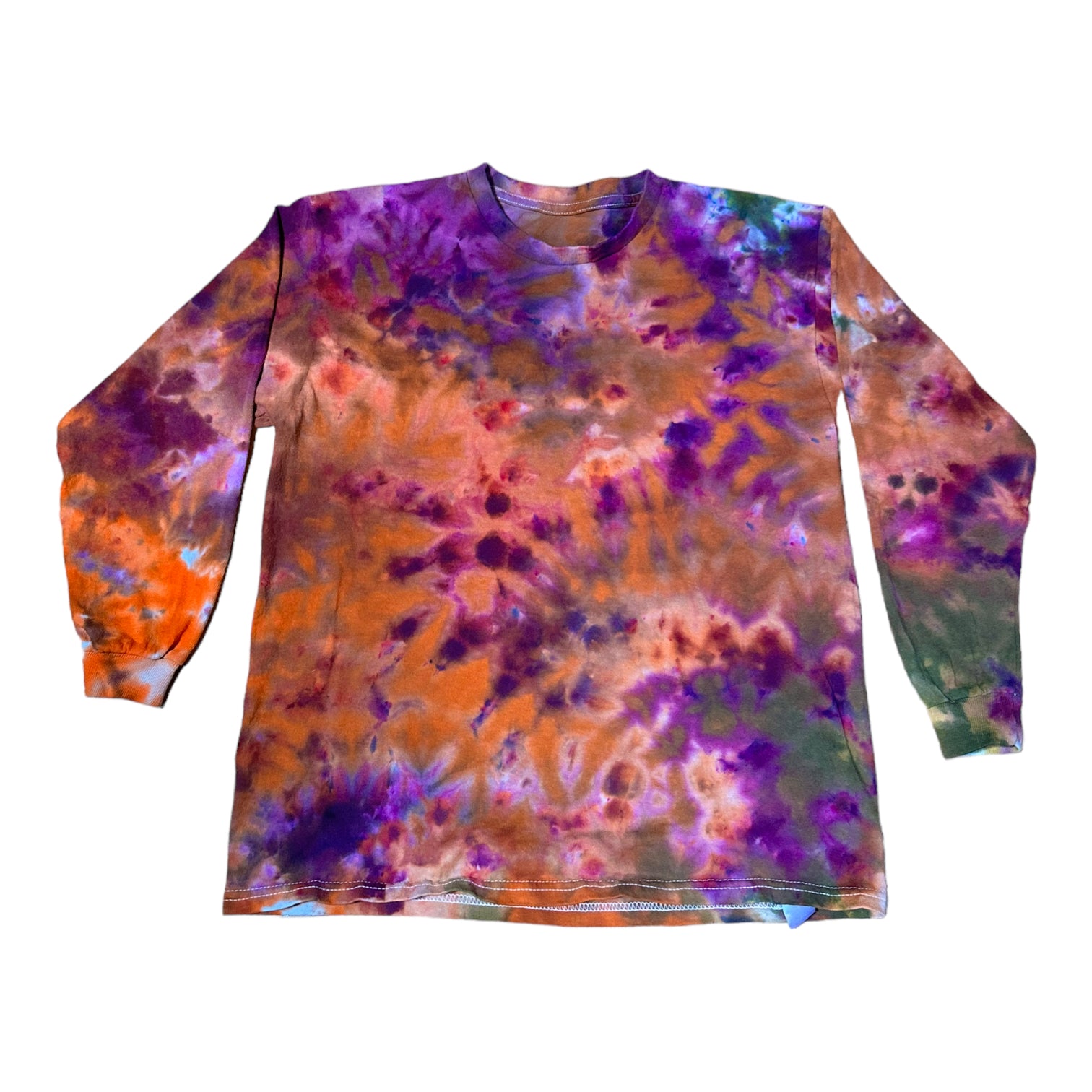 Youth Large Purple Orange and Green Scrunch Ice Dye Tie Dye Long Sleeve Shirt